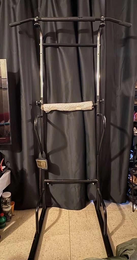 This is a multi-functional pull-up and dip station for home workouts. It features a sturdy metal frame with padded grips. Great for building upper body strength!