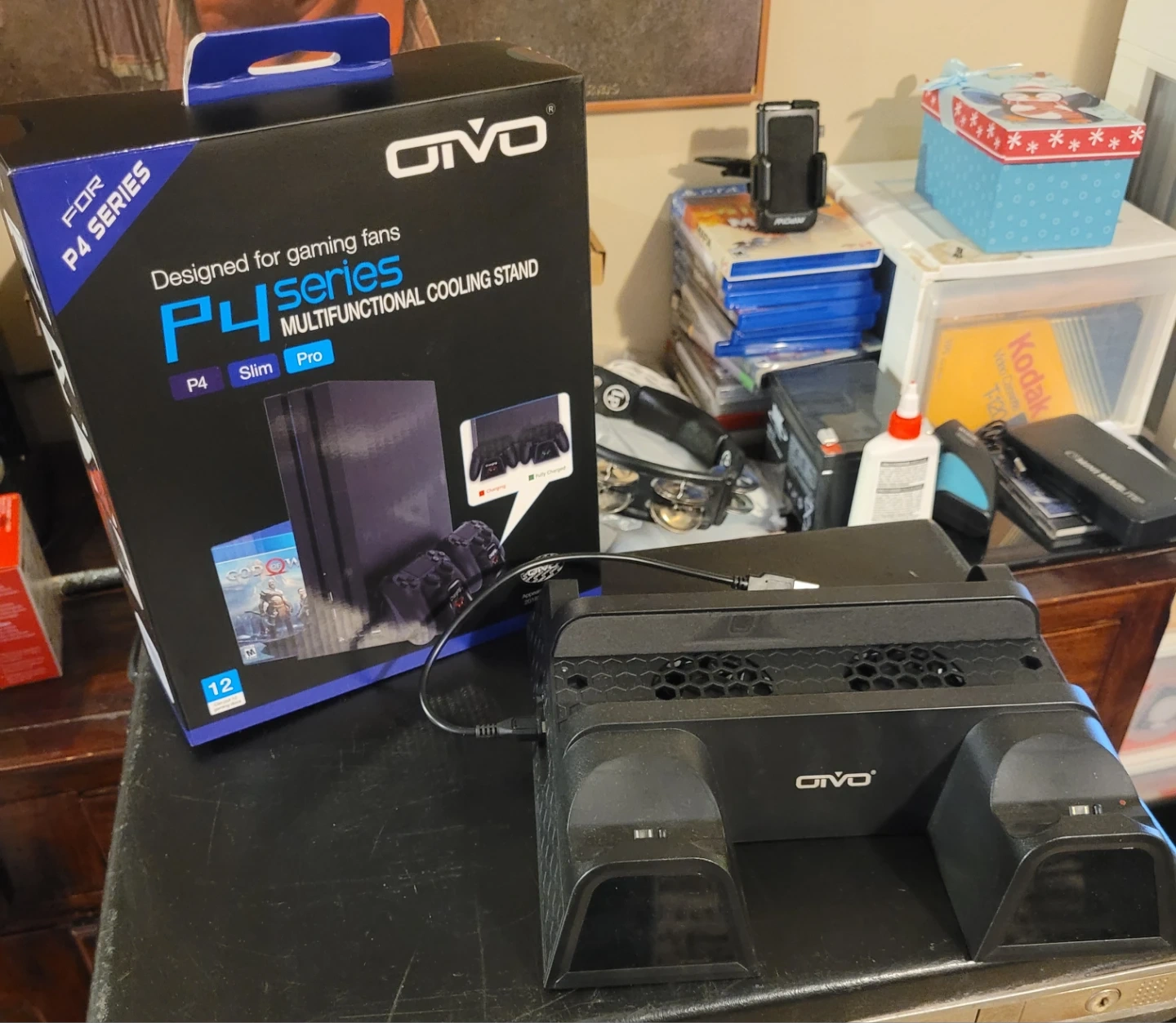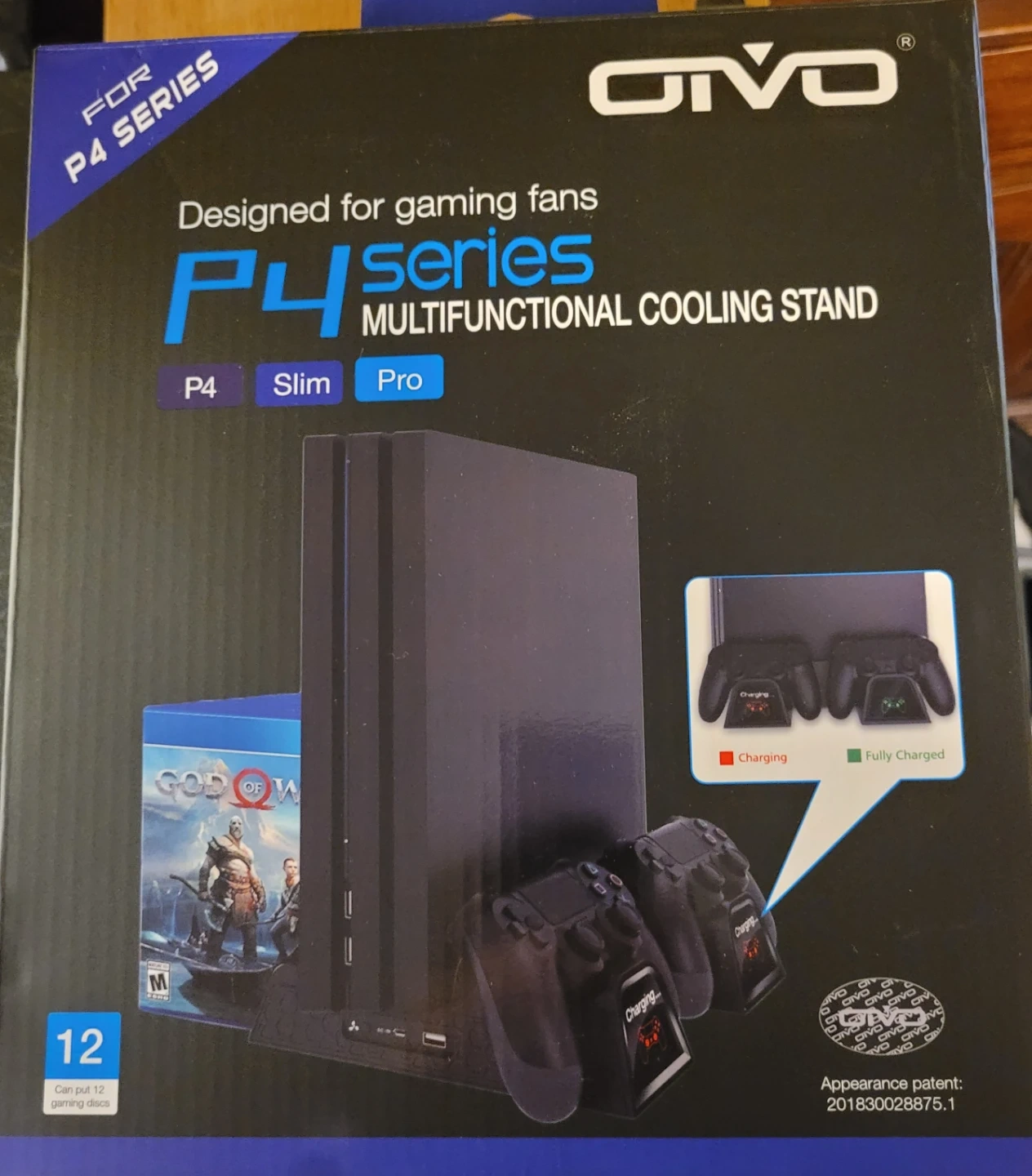 This OTVO cooling stand is designed for P4 series consoles, including Slim and Pro models. It features dual cooling fans to prevent overheating. The stand also includes a charging dock for two controllers.
