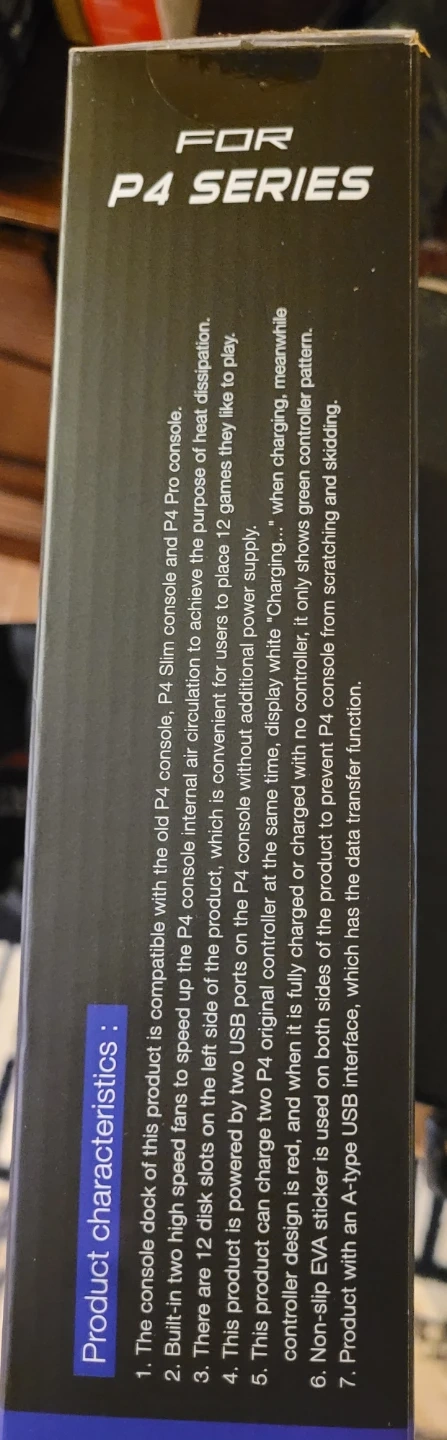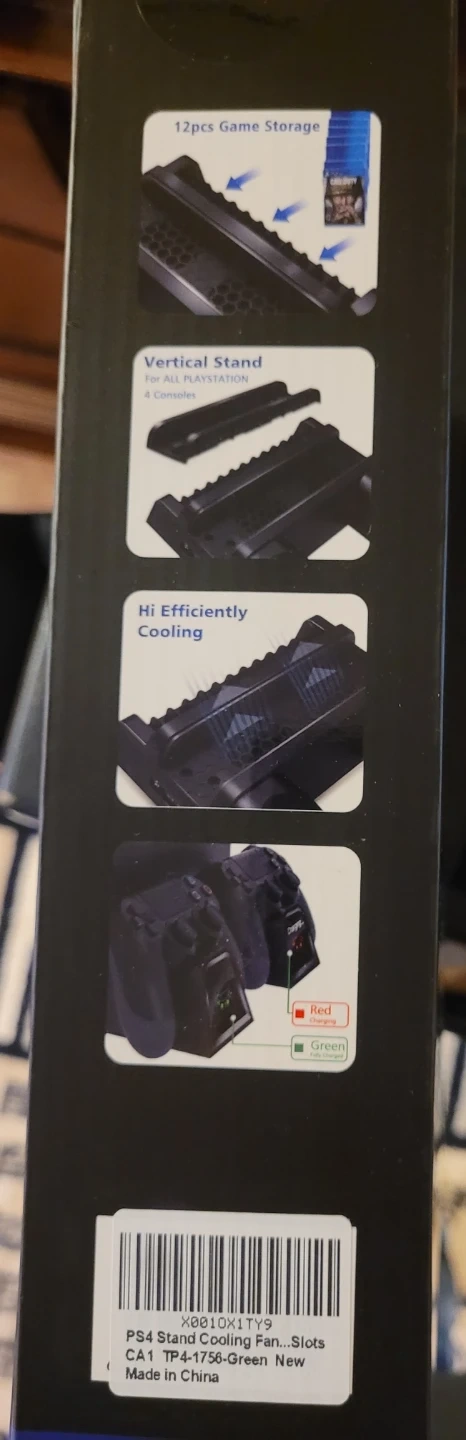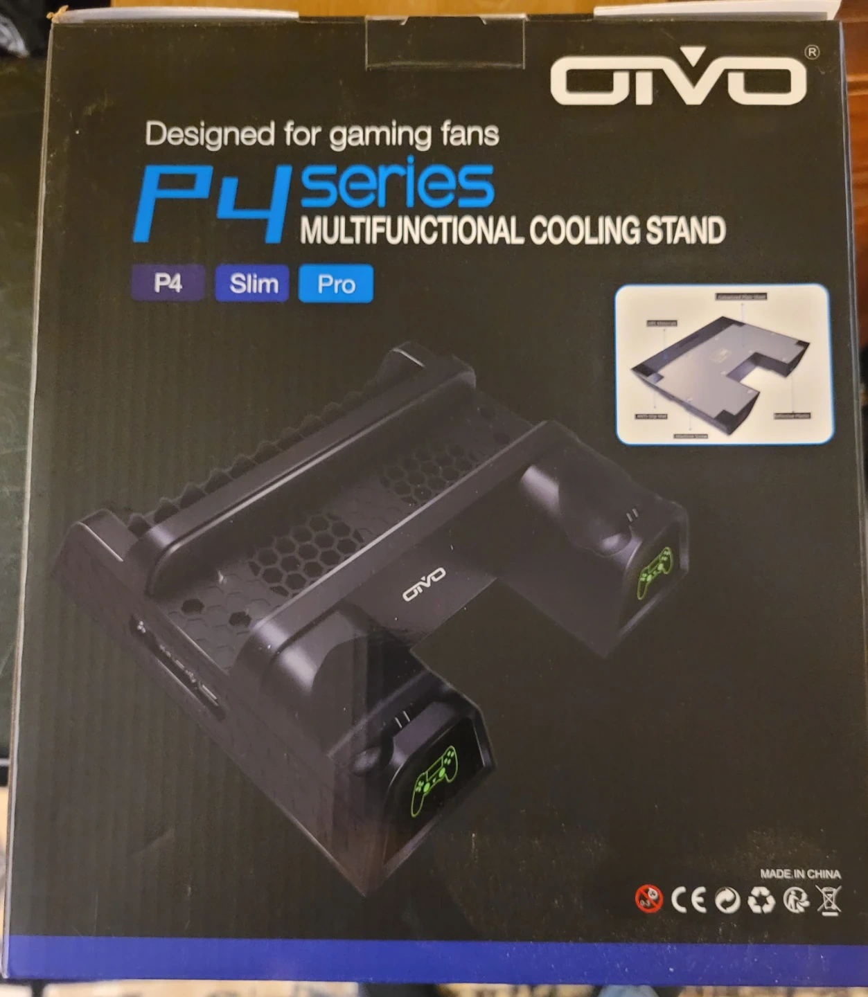 This OTVO cooling stand is designed for P4 series consoles, including Slim and Pro models. It features dual cooling fans to prevent overheating. The stand also includes a charging dock for two controllers.