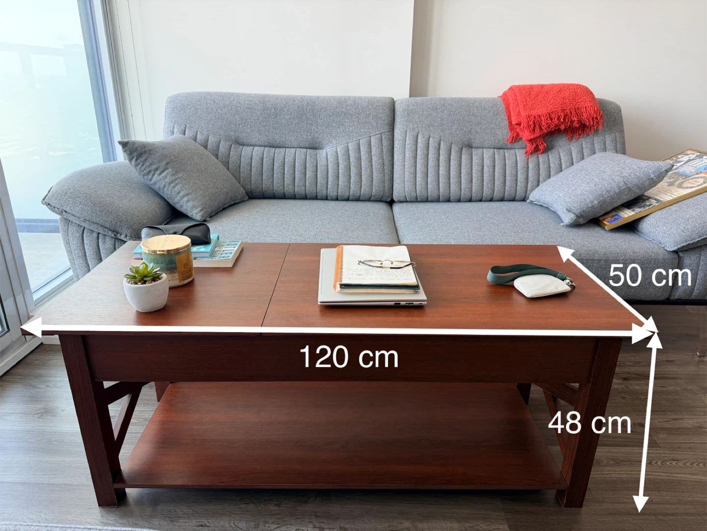 Wooden coffee table with a lift-top feature for easy access to storage. It measures 120 cm long, 50 cm wide, and 48 cm high. Its design includes a lower shelf and a hidden compartment under the tabletop, great for organizing living room essentials.