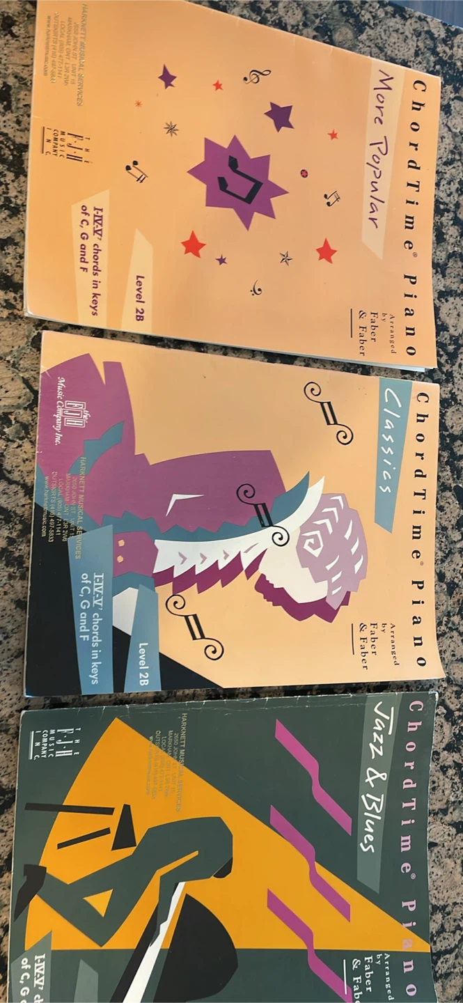 Selling three ChordTime Piano books arranged by Faber & Faber: More Popular, Classics, and Jazz & Blues. These are level 2B books, perfect for learning I-IV-V' chords in the keys of C, G, and F