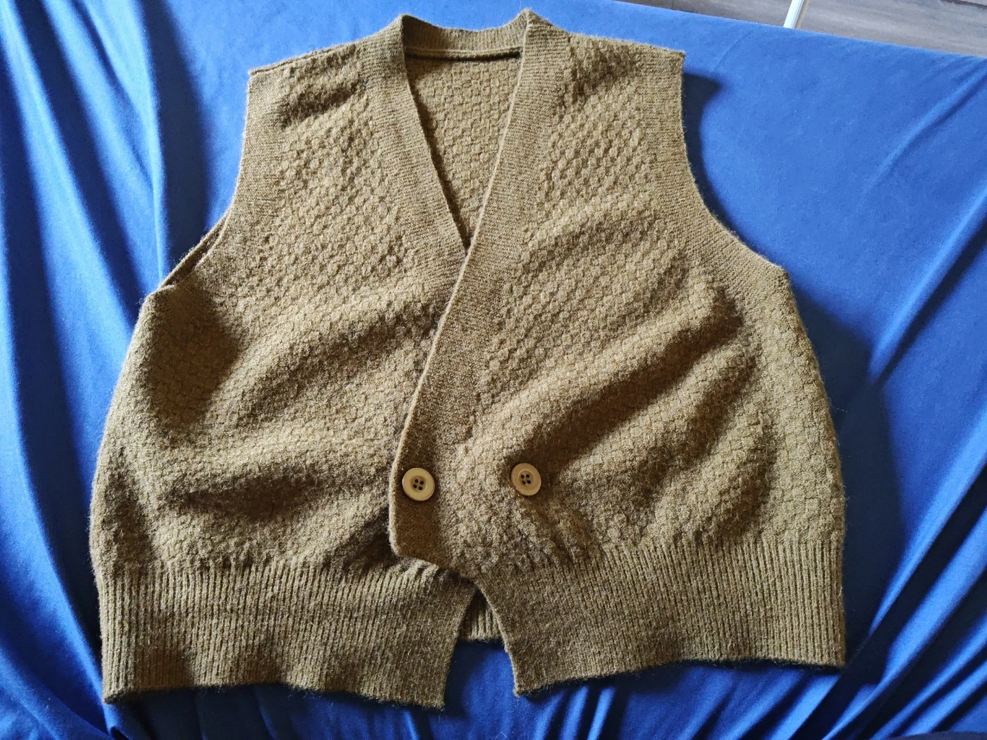 This is a one-size knit vest with two buttons. It's made from a blend of 50% Acrylic, 30% Polyester, and 20% Polyamide. It's a versatile piece for layering!