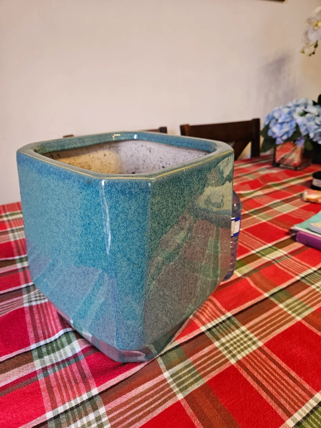 This is a large, blue-green speckled ceramic planter pot. It's octagonal in shape with a wide opening. This pot is ideal for a larger houseplant or outdoor greenery.