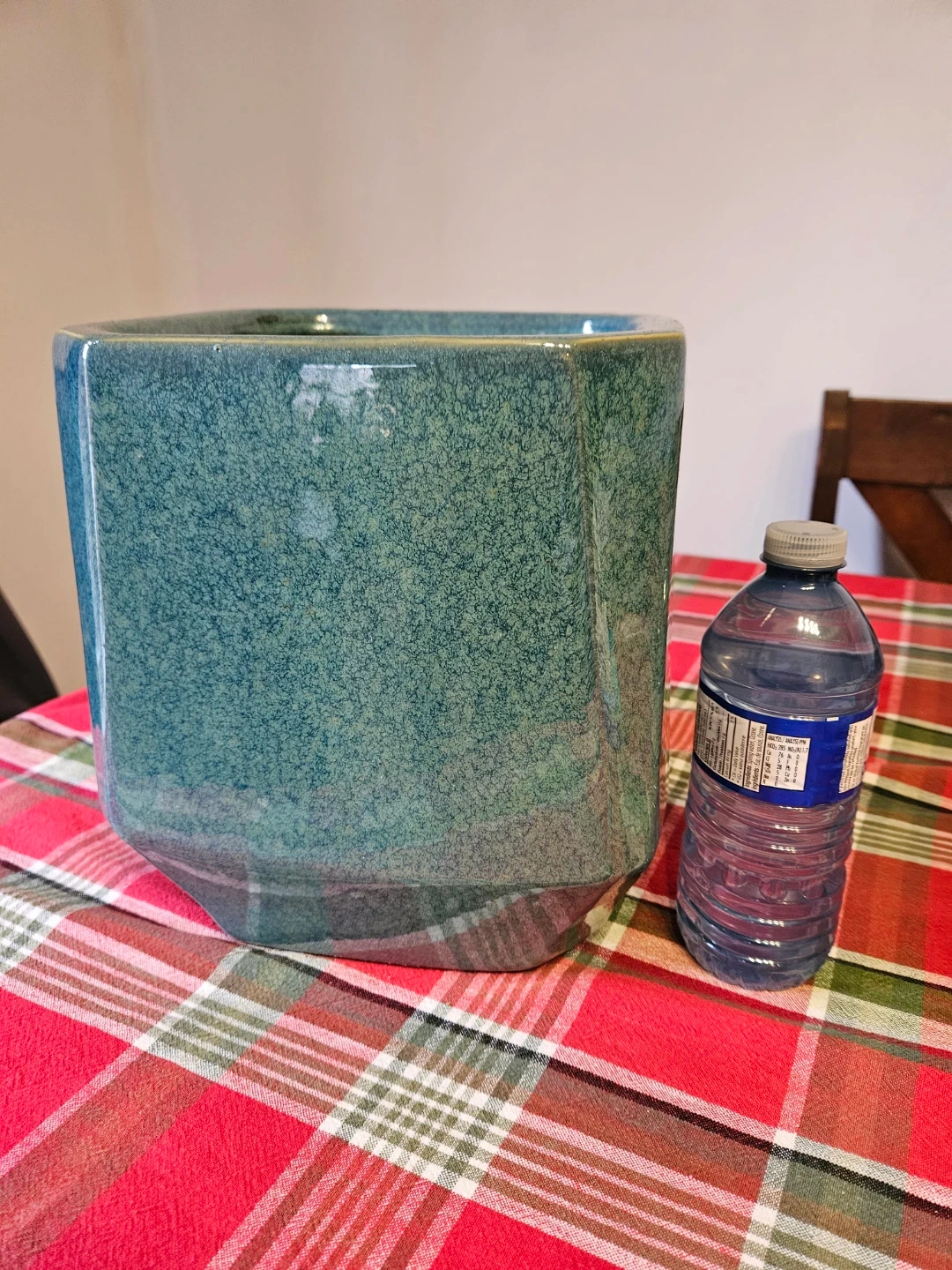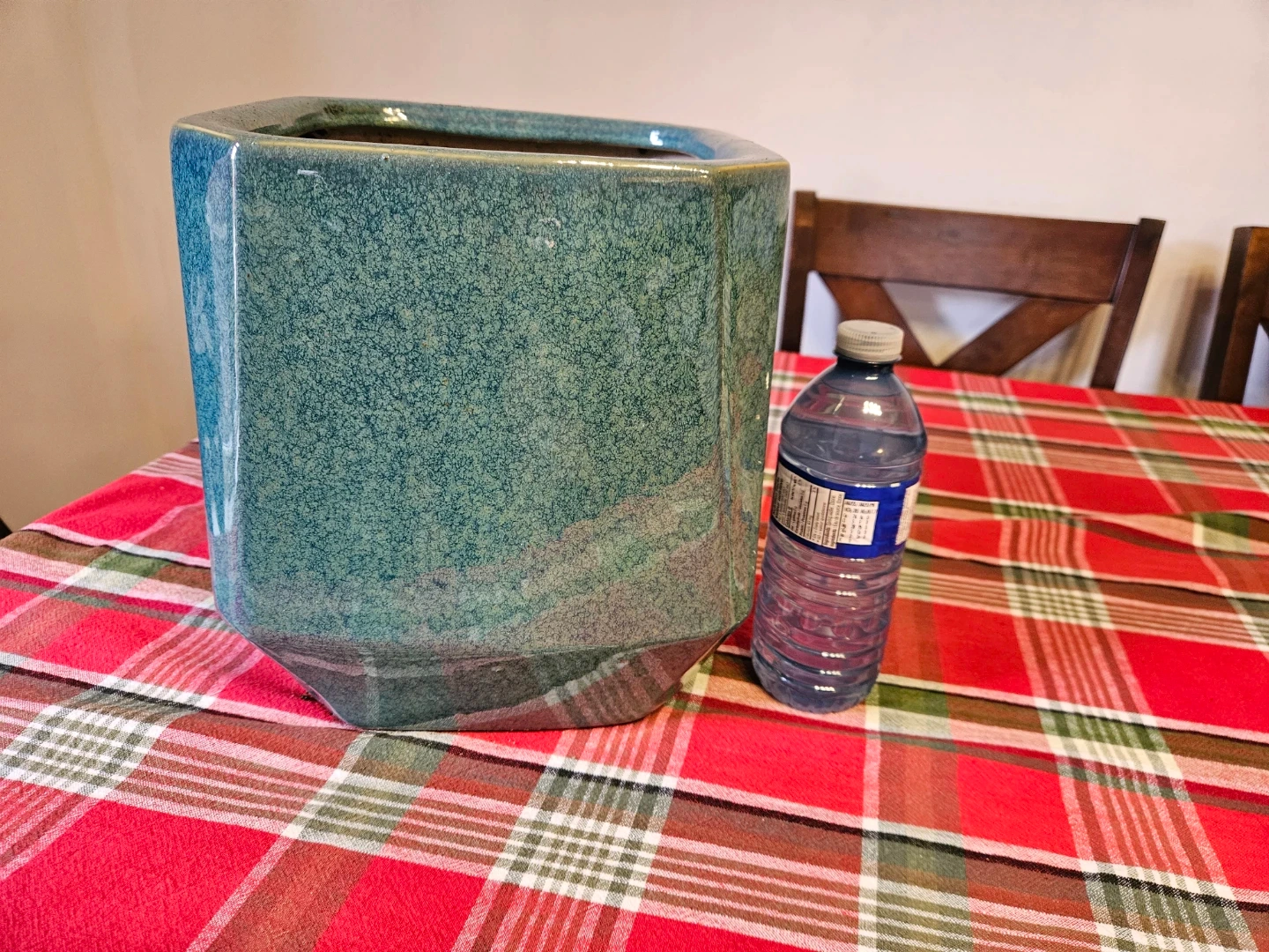 This is a large, blue-green speckled ceramic planter pot. It's octagonal in shape with a wide opening. This pot is ideal for a larger houseplant or outdoor greenery.