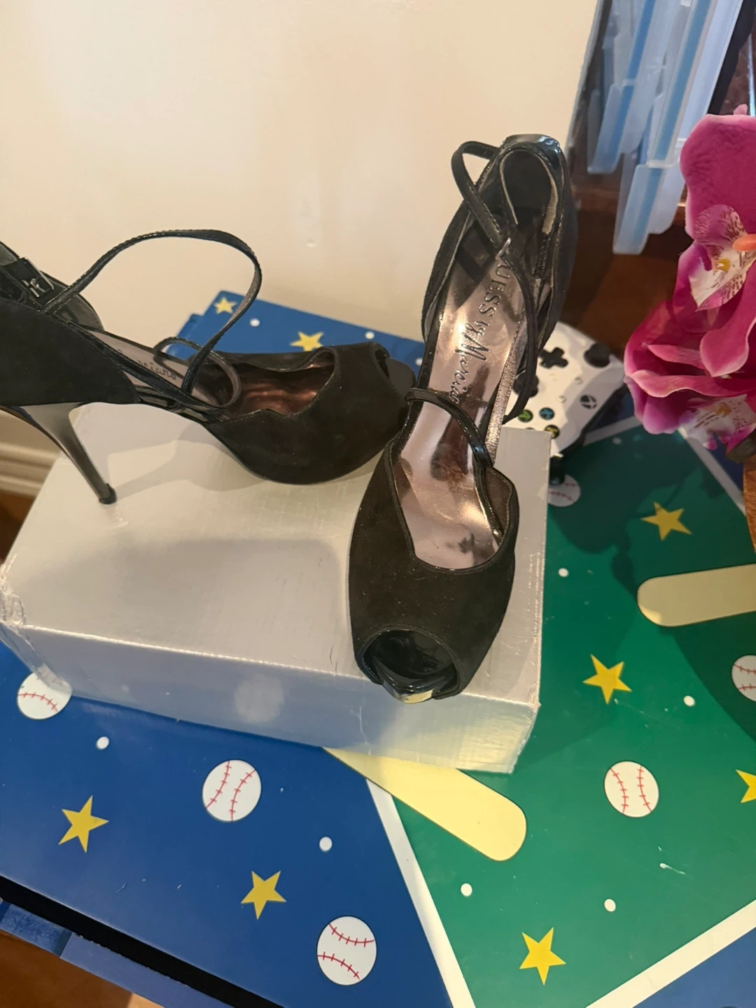 Black suede peep-toe heels with straps and a metallic silver heel. Brand name 'Guess' is visible on the insole. Women's size not specified. These heels offer a stylish look.