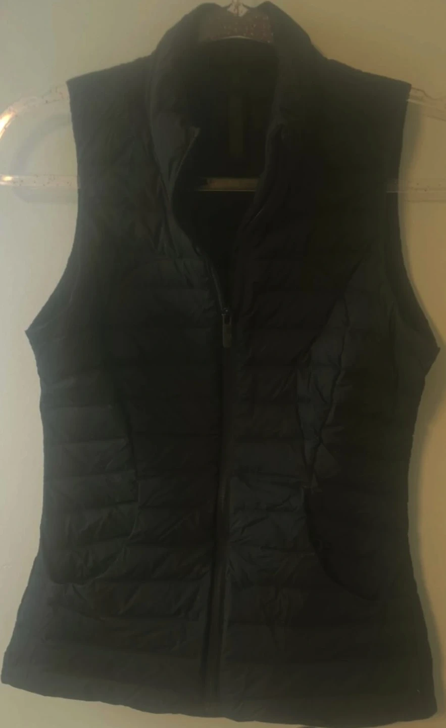 This is a black Lululemon puffer vest. It's a sleeveless design with a full zip front. It's perfect for layering on cooler days!