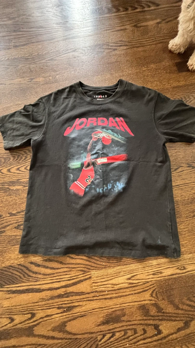 This is a black Jordan t-shirt with a graphic print. It's a size S and made from cotton. Loose fit style.