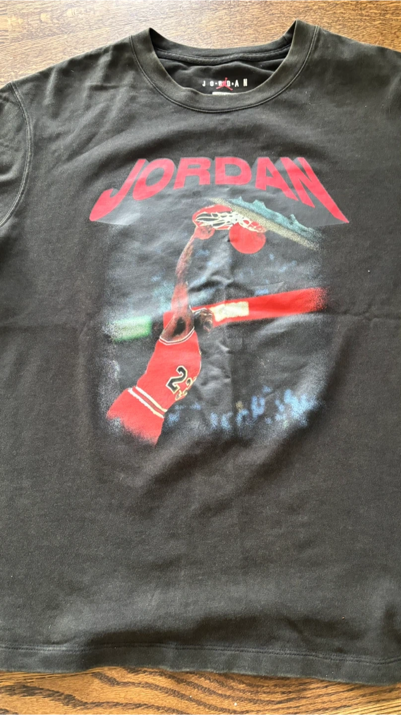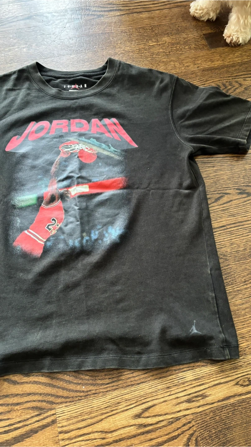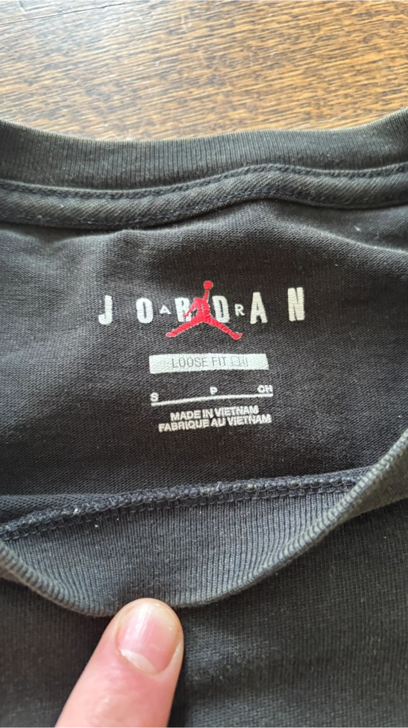 This is a black Jordan t-shirt with a graphic print. It's a size S and made from cotton. Loose fit style.