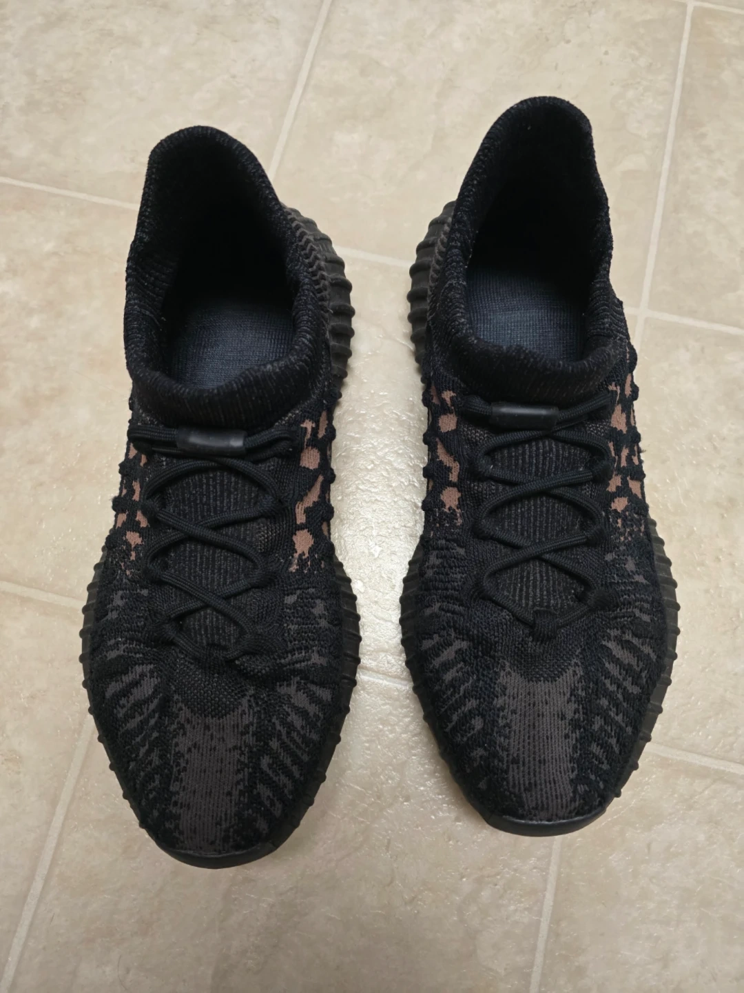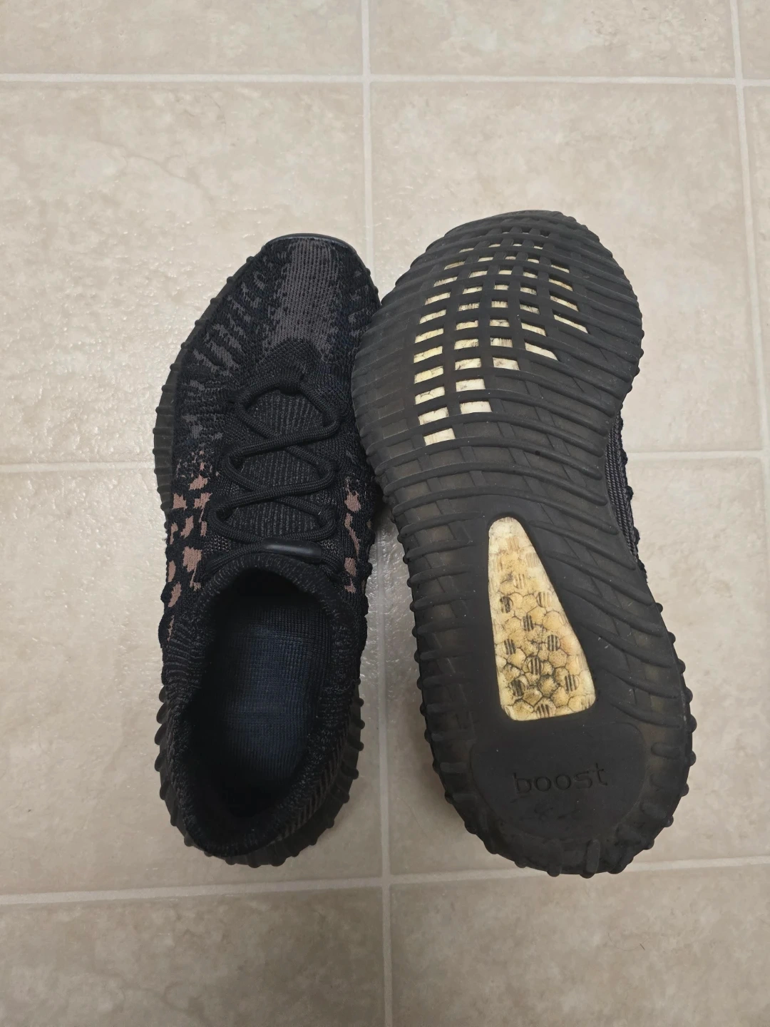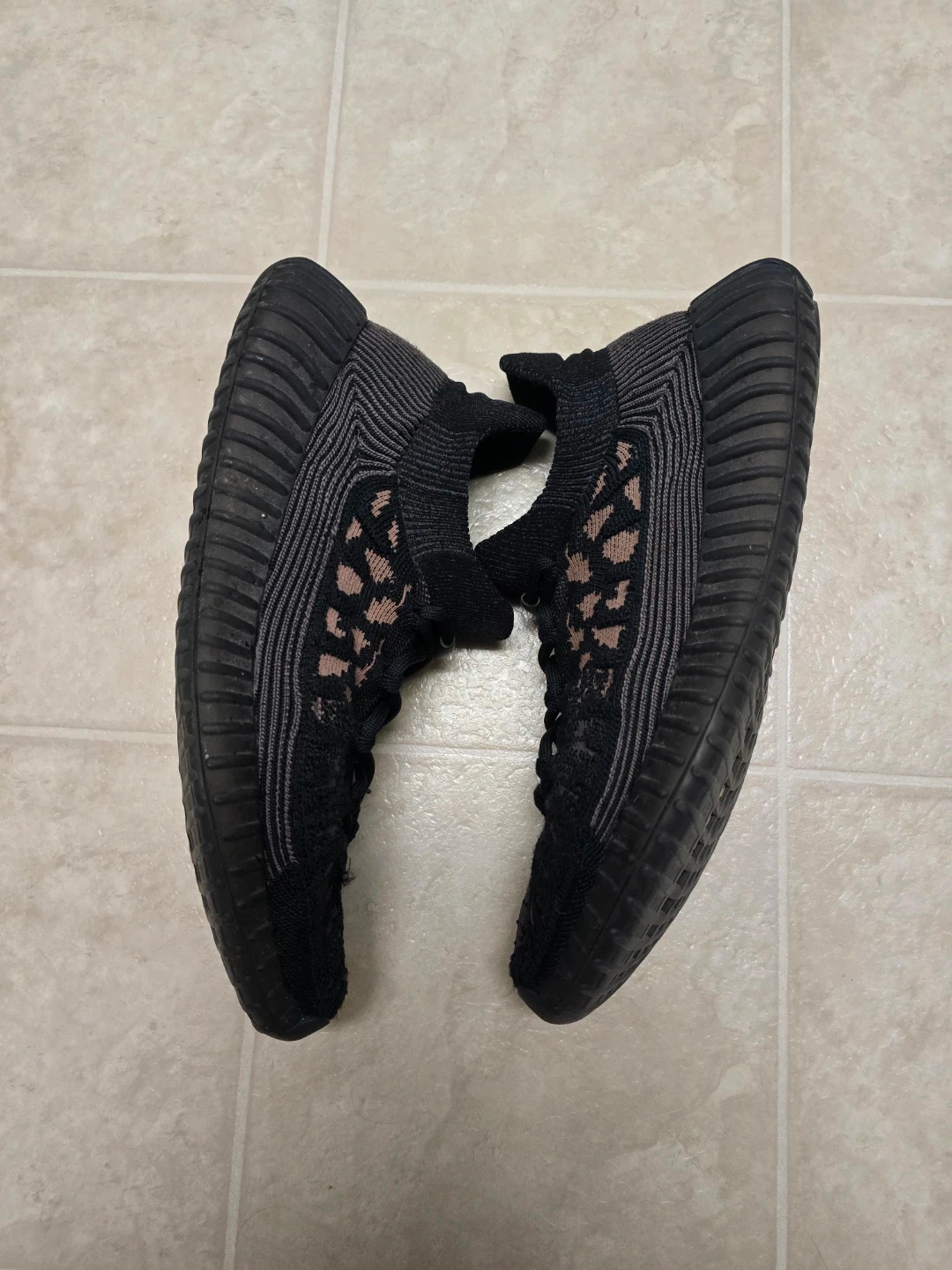 Black knit Adidas Yeezy Boost V2 CMPCT sneakers. Features a pull-tab heel and "boost" sole technology. These are used and in a size 10.5