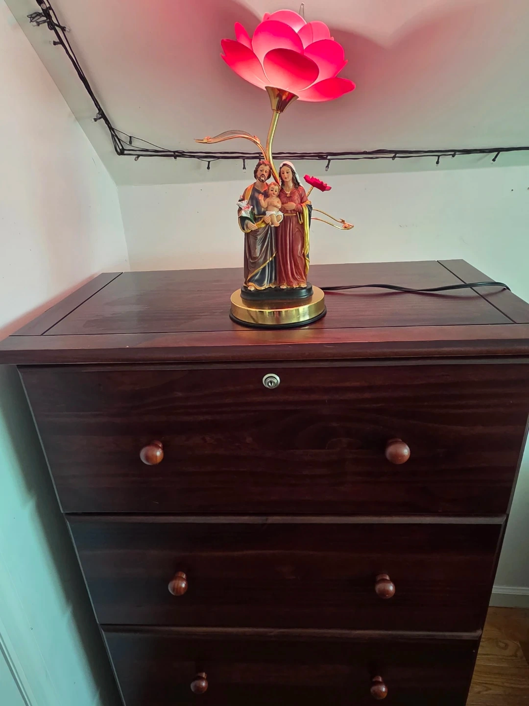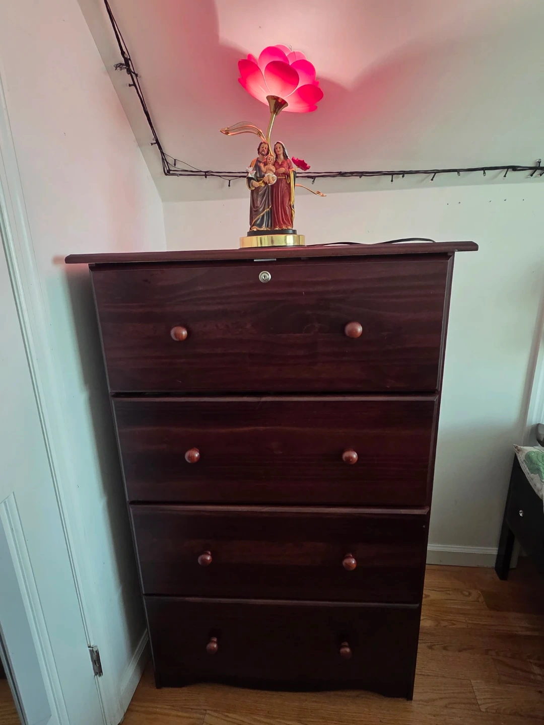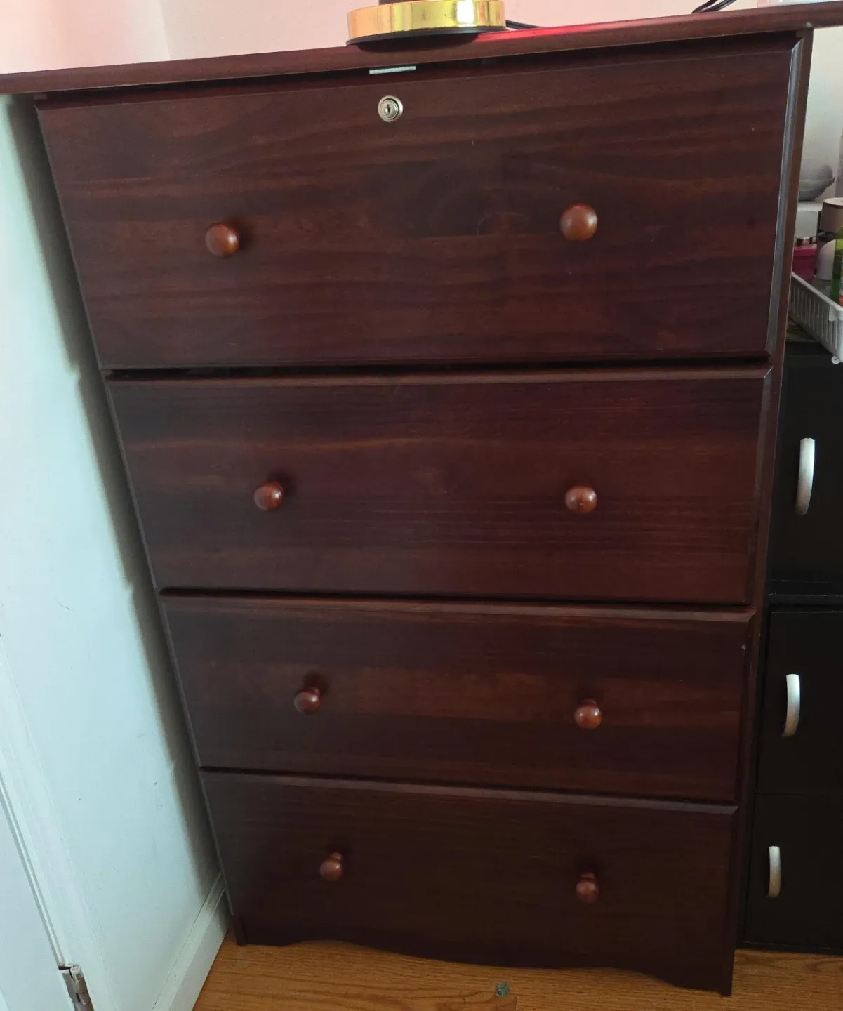 This dark wood dresser has five drawers for storage. It features classic wooden knob handles and a sturdy design. It's a great piece for organizing any bedroom!