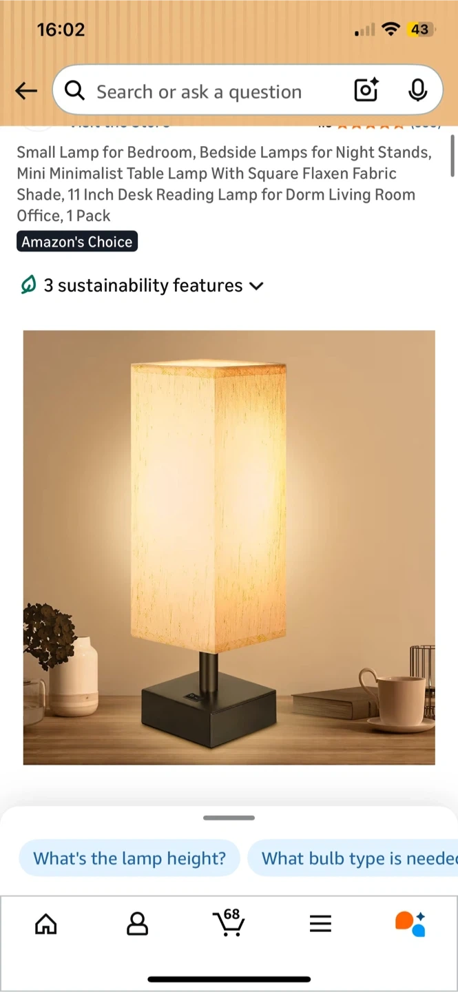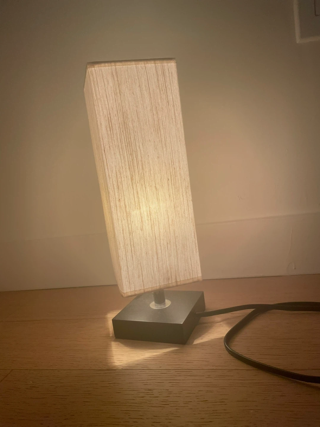 This small bedside lamp has a flaxen fabric shade and a square base. It's designed for night stands and desks. Provides a soft, warm light.