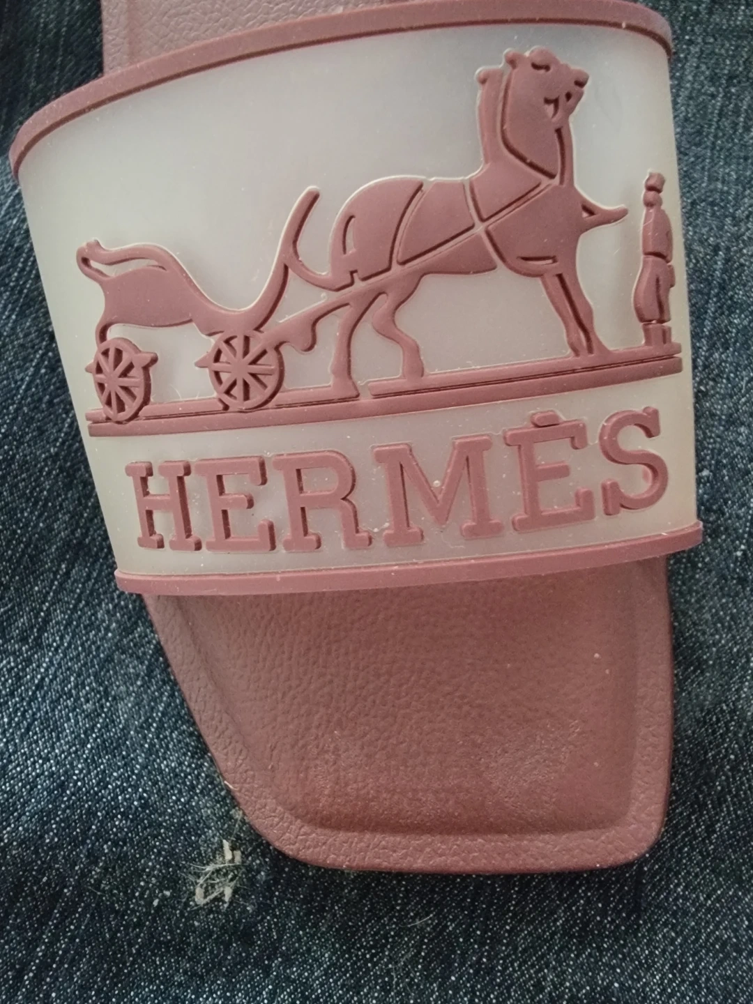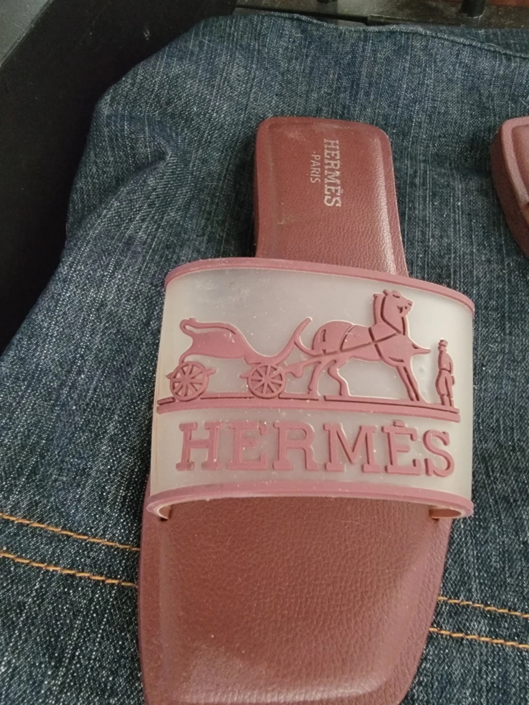 Hermès Paris slides with the iconic horse and carriage logo. These stylish sandals are a pretty dusty rose colour with a translucent white strap. Perfect for a casual day out!