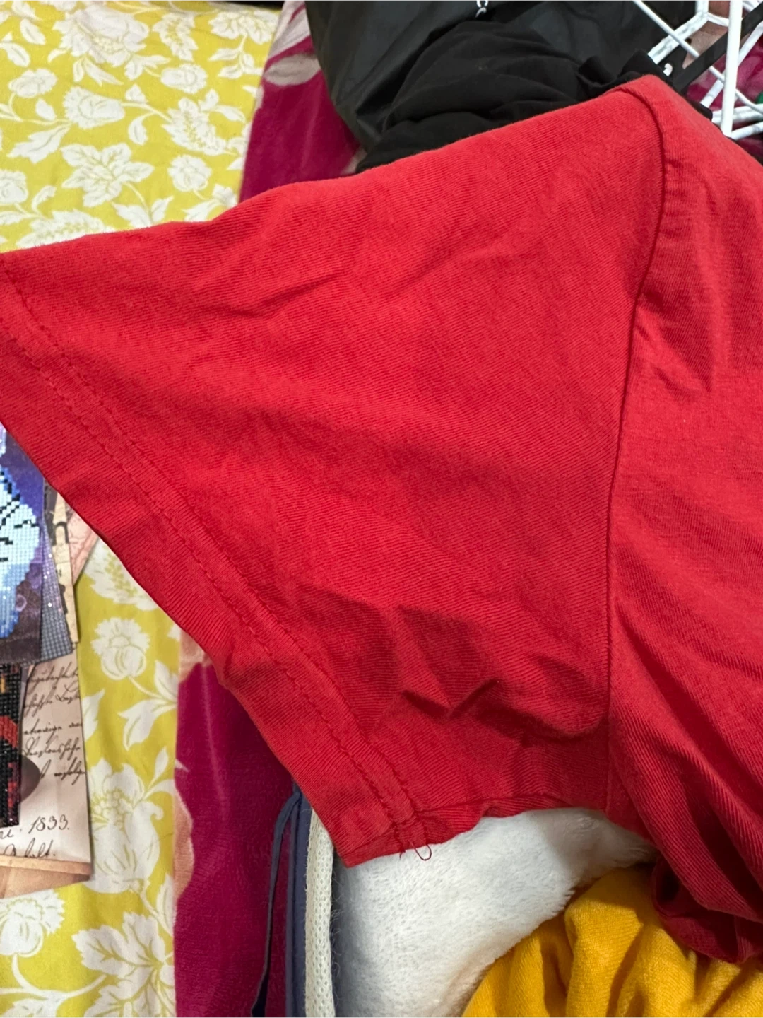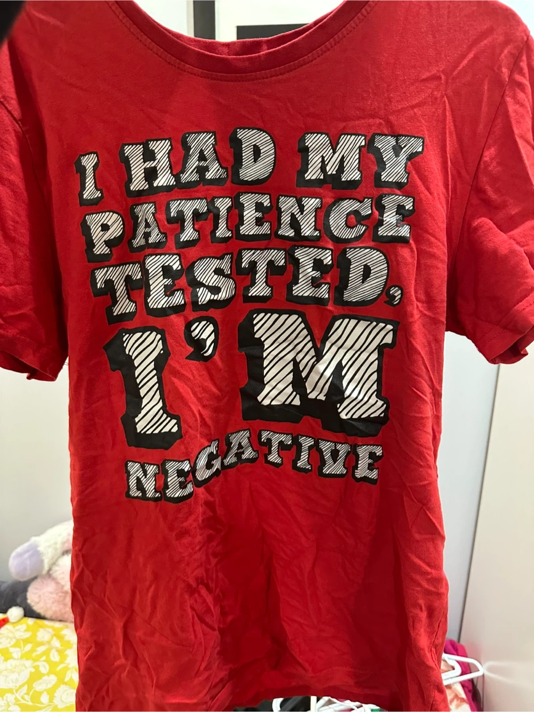 This red t-shirt features the quote "I HAD MY PATIENCE TESTED. I'M NEGATIVE" printed in bold lettering. It's made of 100% cotton and is a size S/P. Machine wash inside out in cold water.