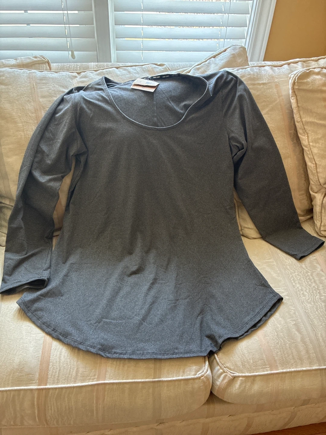 A long sleeve top from Just Cozy in a dark grey heathered material. It's a size XL with a wide scoop neckline and a flattering curved hem. Perfect for layering or wearing on its own!