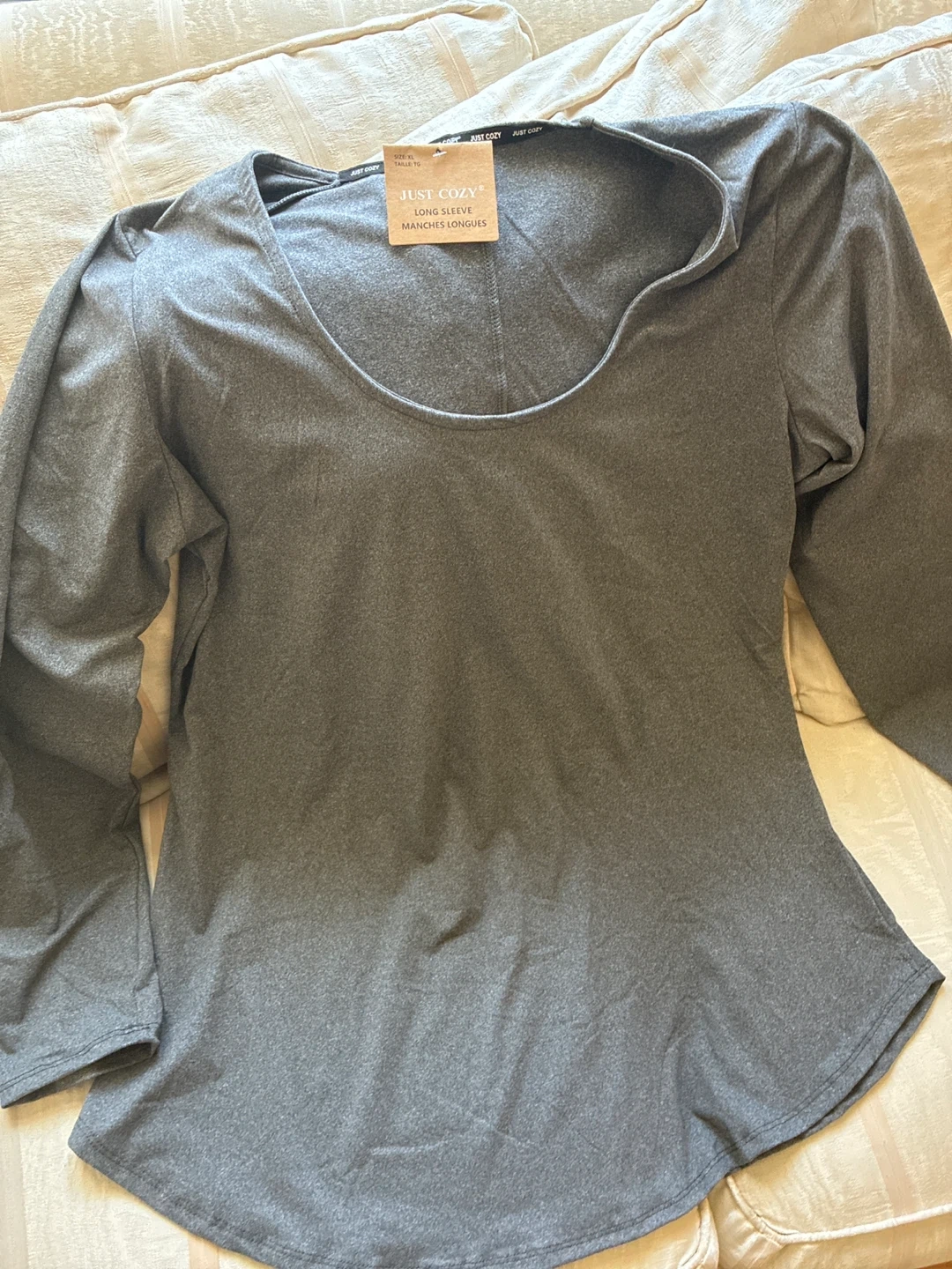A long sleeve top from Just Cozy in a dark grey heathered material. It's a size XL with a wide scoop neckline and a flattering curved hem. Perfect for layering or wearing on its own!