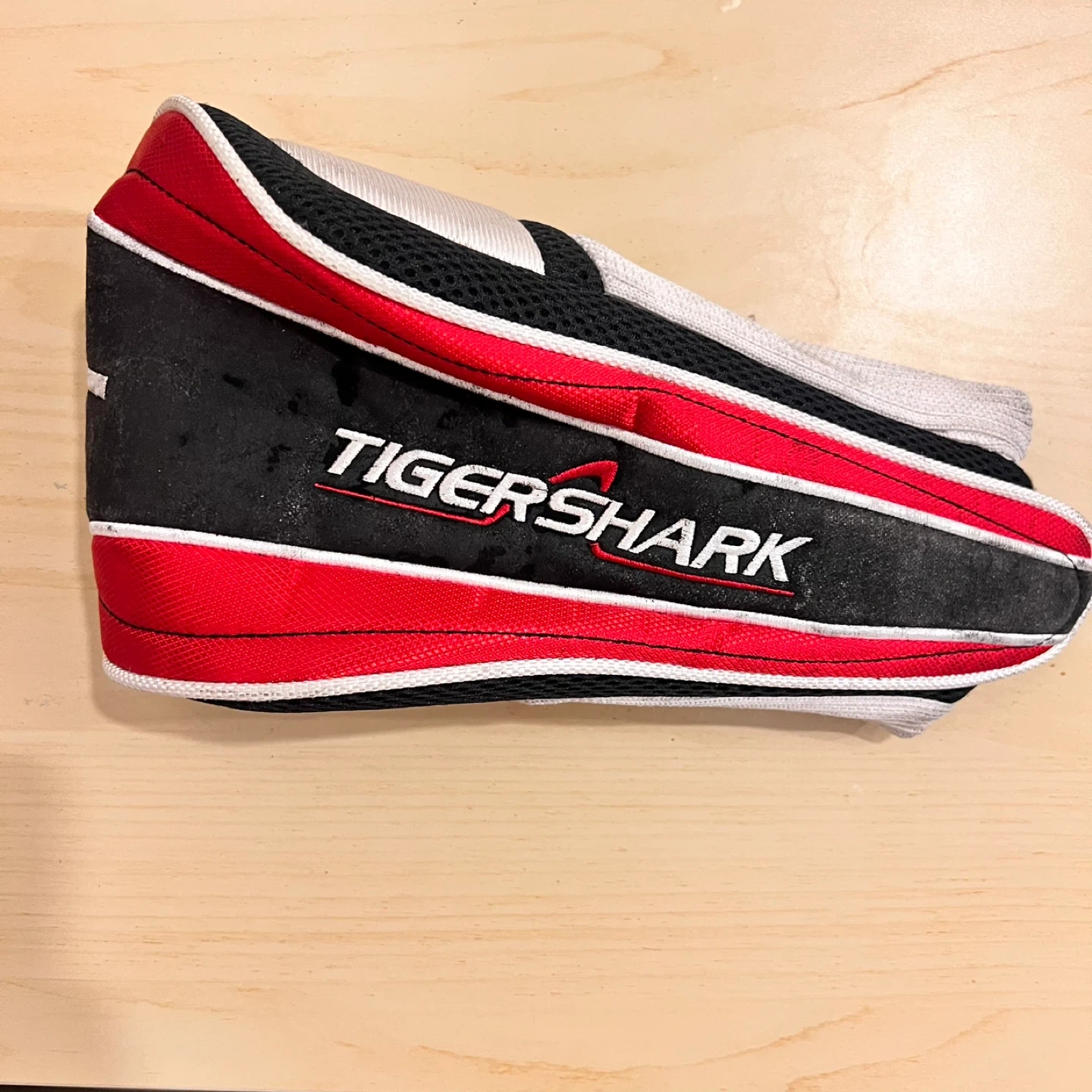 This is a Tiger Shark golf club headcover, marked with a '1'. It's designed to protect your clubs on the course. The headcover is made of a durable material with red and black accents.