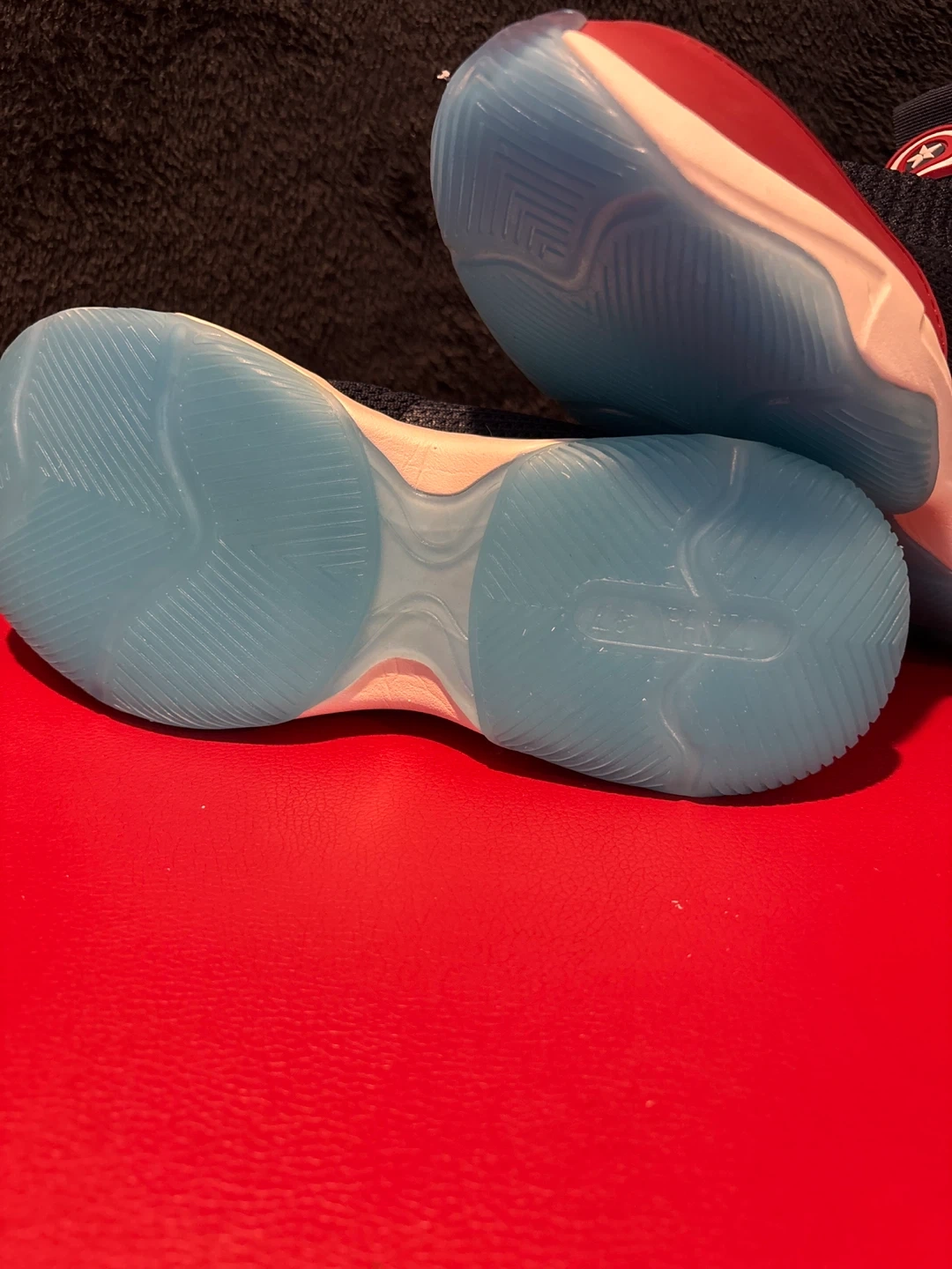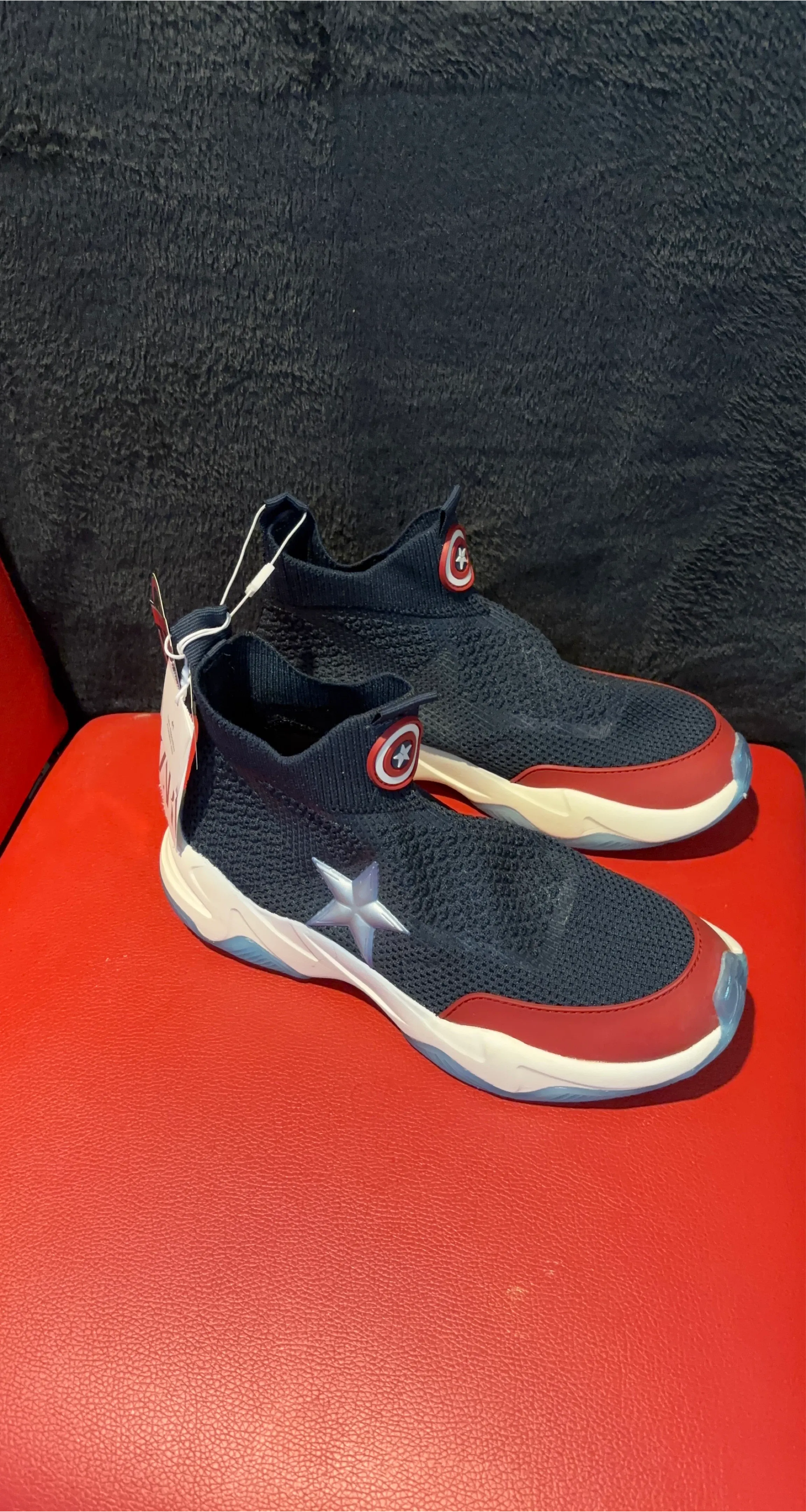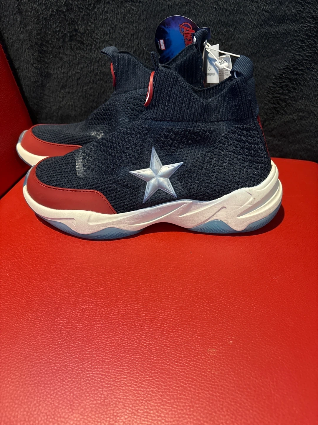 These running sneakers feature a Captain America theme with star graphics. They're designed as high-top slip-ons with a comfortable knit upper. Red, white, and blue color scheme with a translucent blue sole. Brand new. Size 41 kids