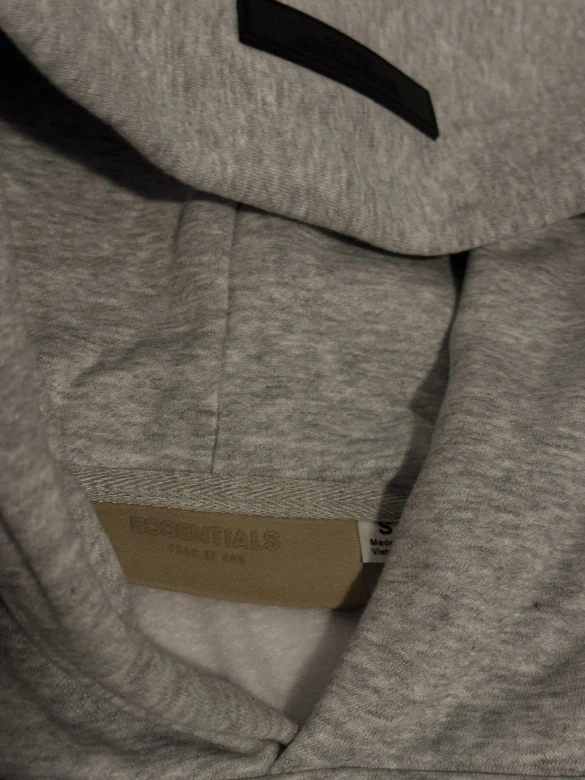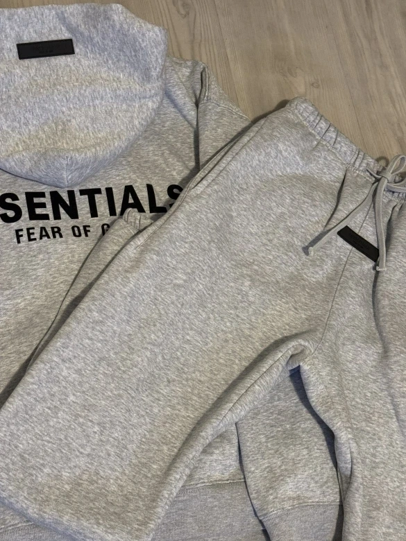This is a Fear of God Essentials hoodie and sweatpants set. Both pieces are grey and newl. Made of cotton blend material. Message me for information