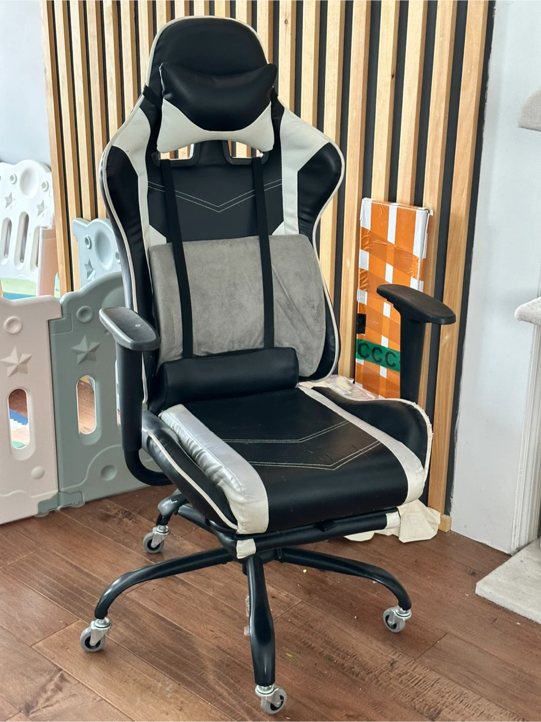 This is a black and white gaming chair. It includes adjustable lumbar and headrest pillows for extra comfort. The chair has a sturdy base with wheels for easy mobility.