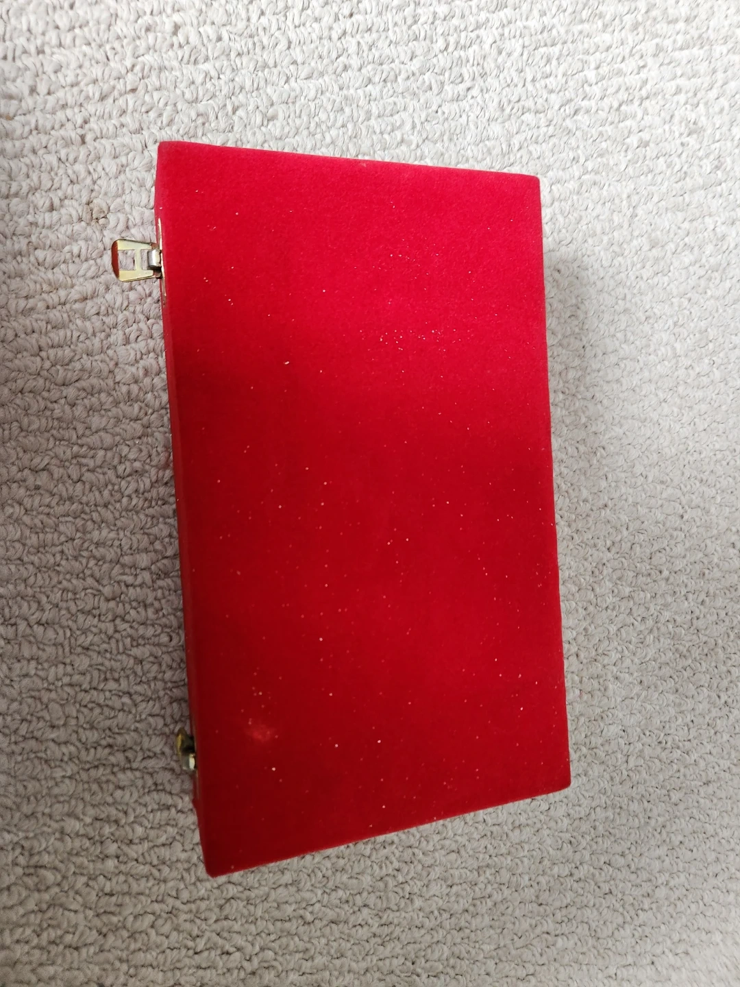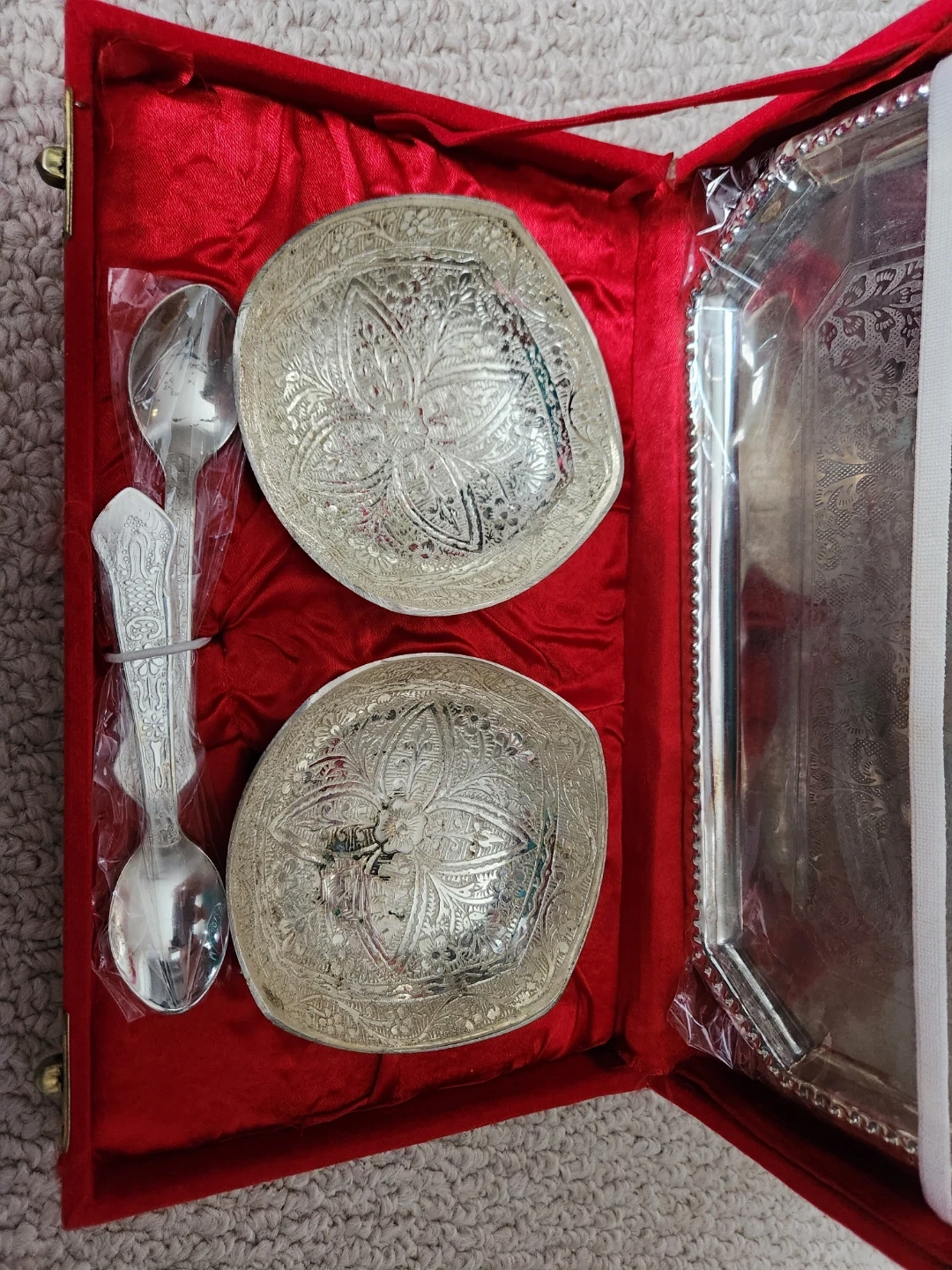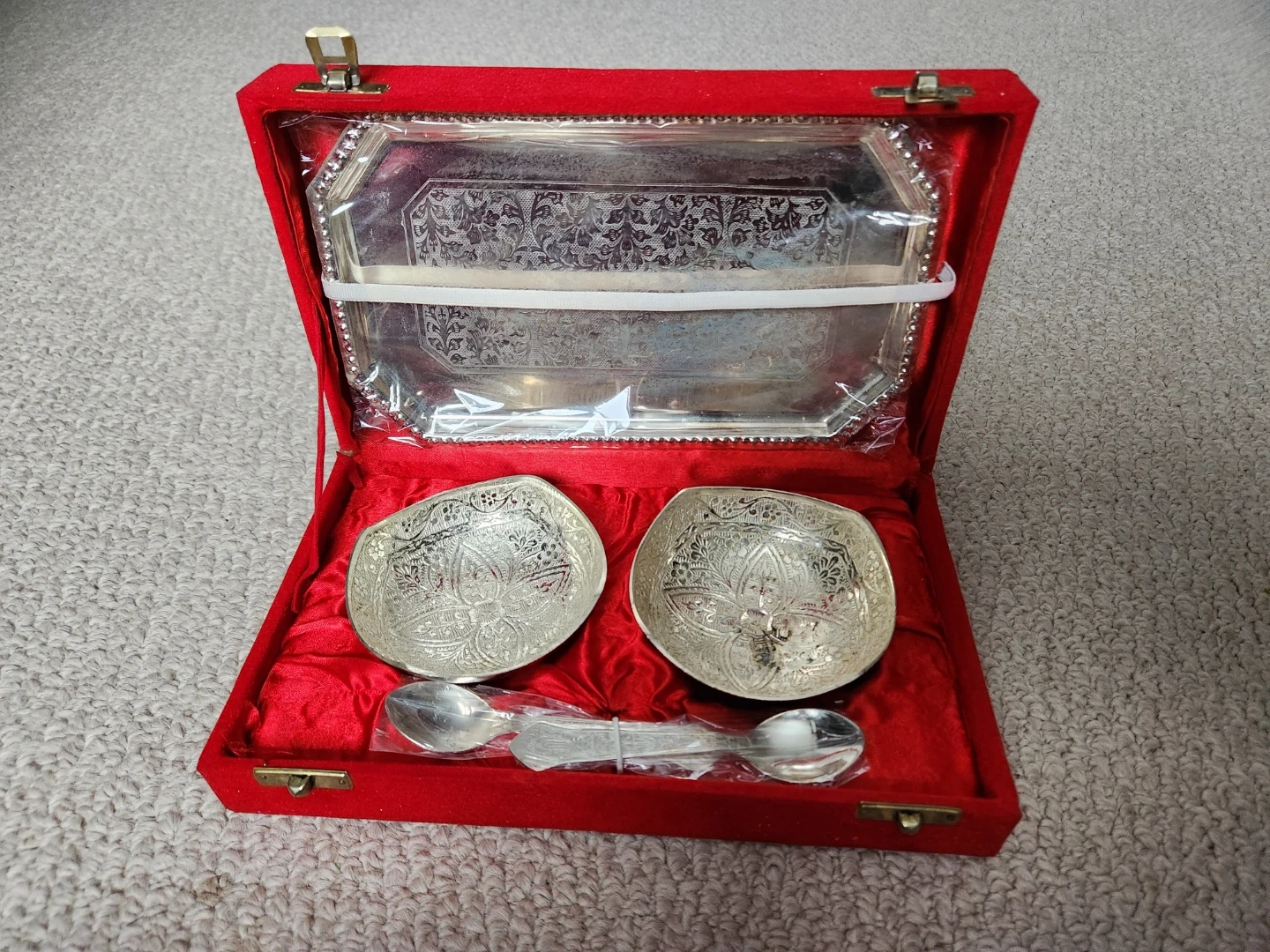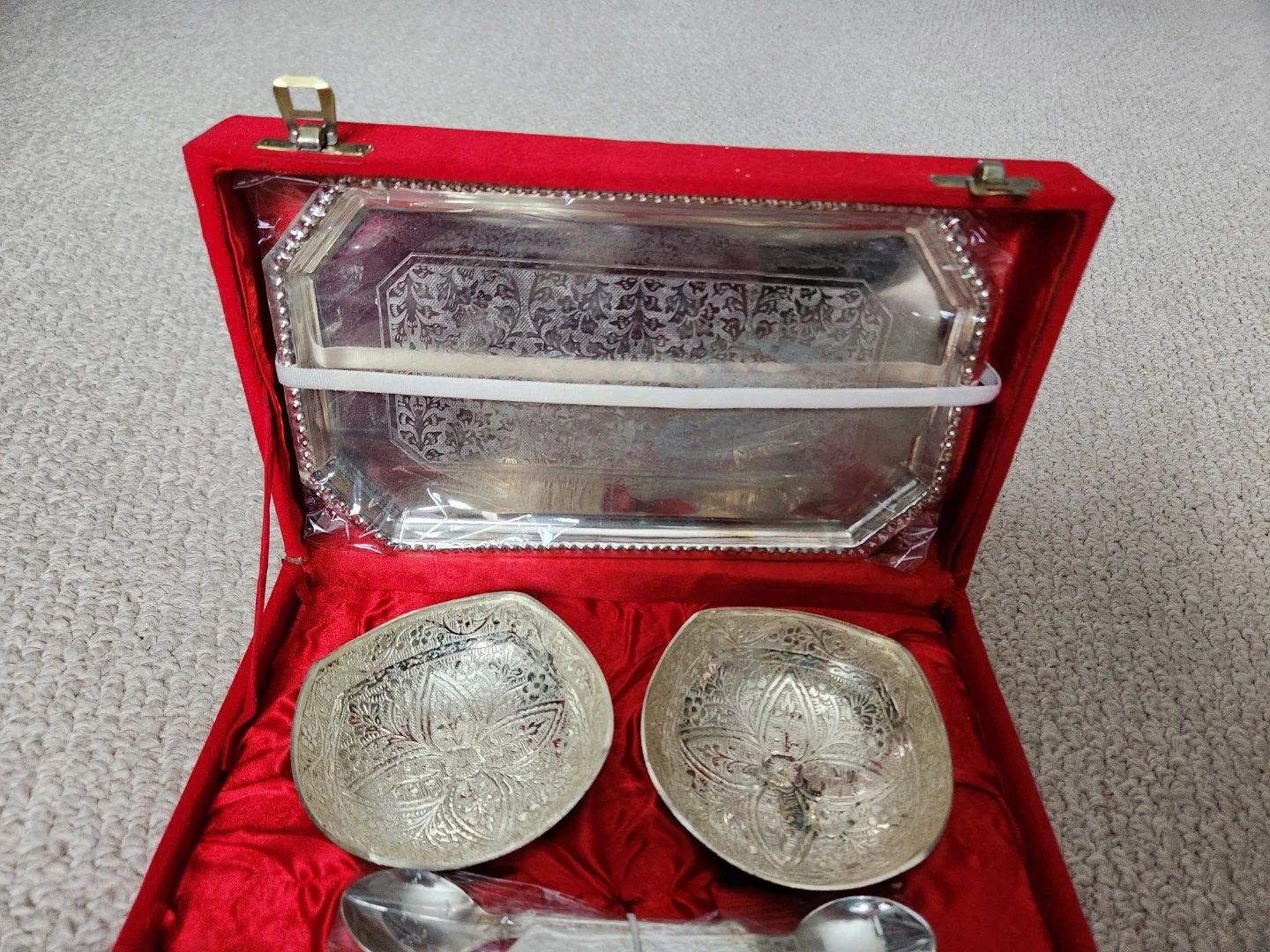 This set includes two ornate, silver-plated decorative bowls and a matching tray, along with two spoons. The items are presented in a red velvet-lined case. They feature intricate embossed floral patterns.