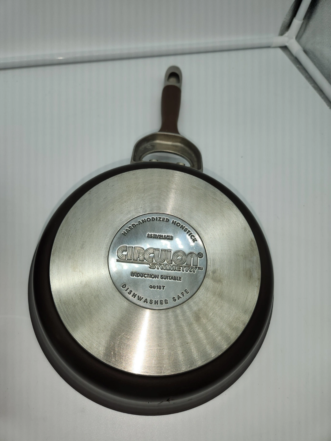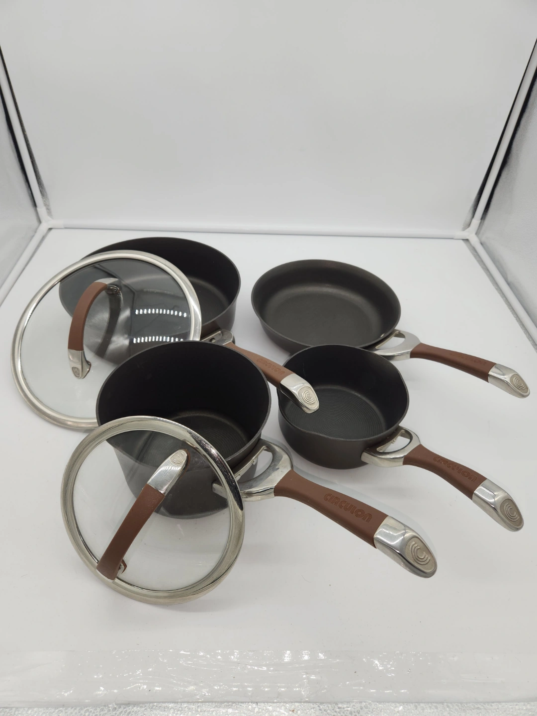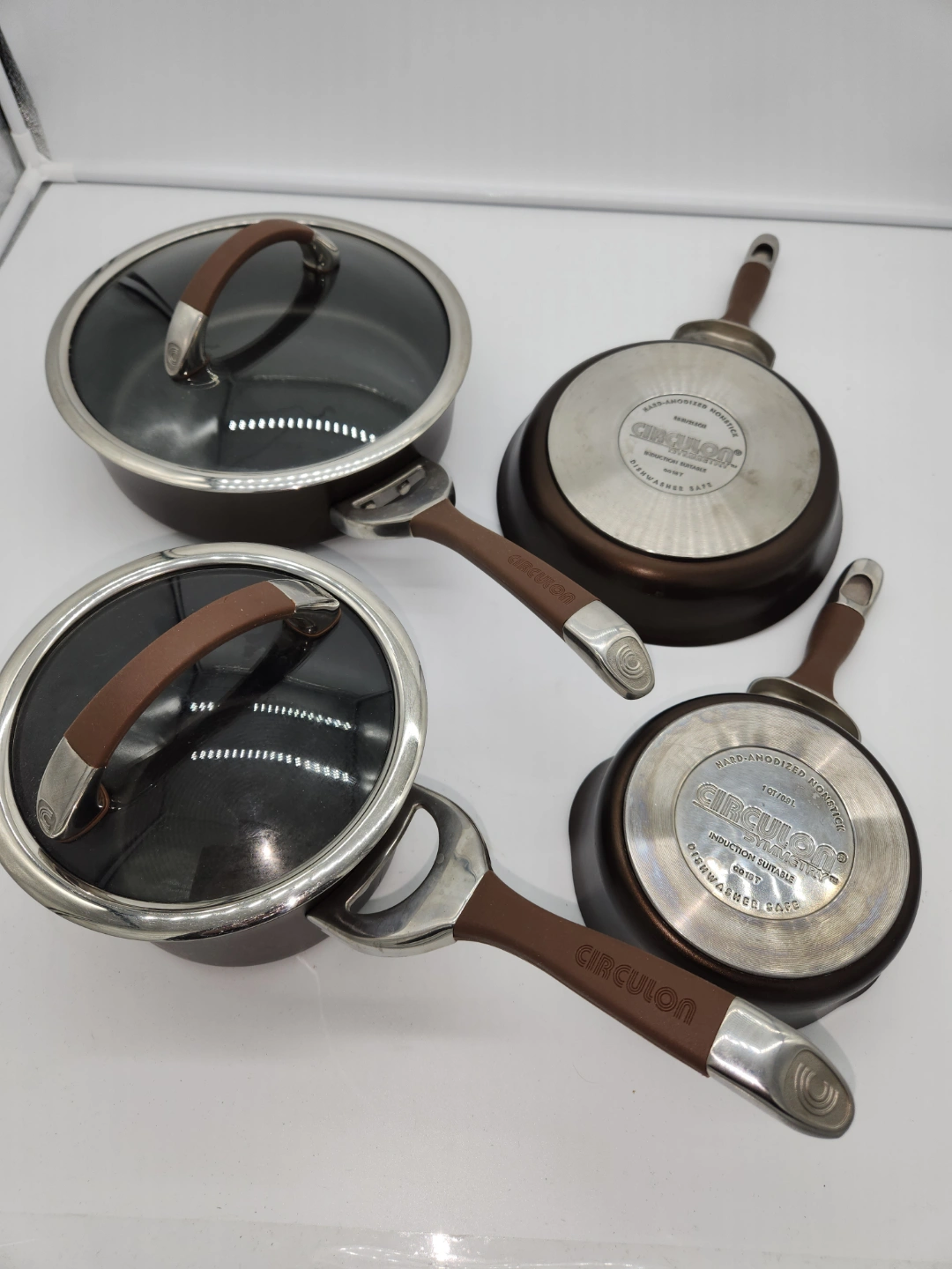 Five-piece cookware set. Includes two saucepans with lids and a frying pan. Hard-anodized nonstick. Induction suitable. Dishwasher safe. Brown handles.