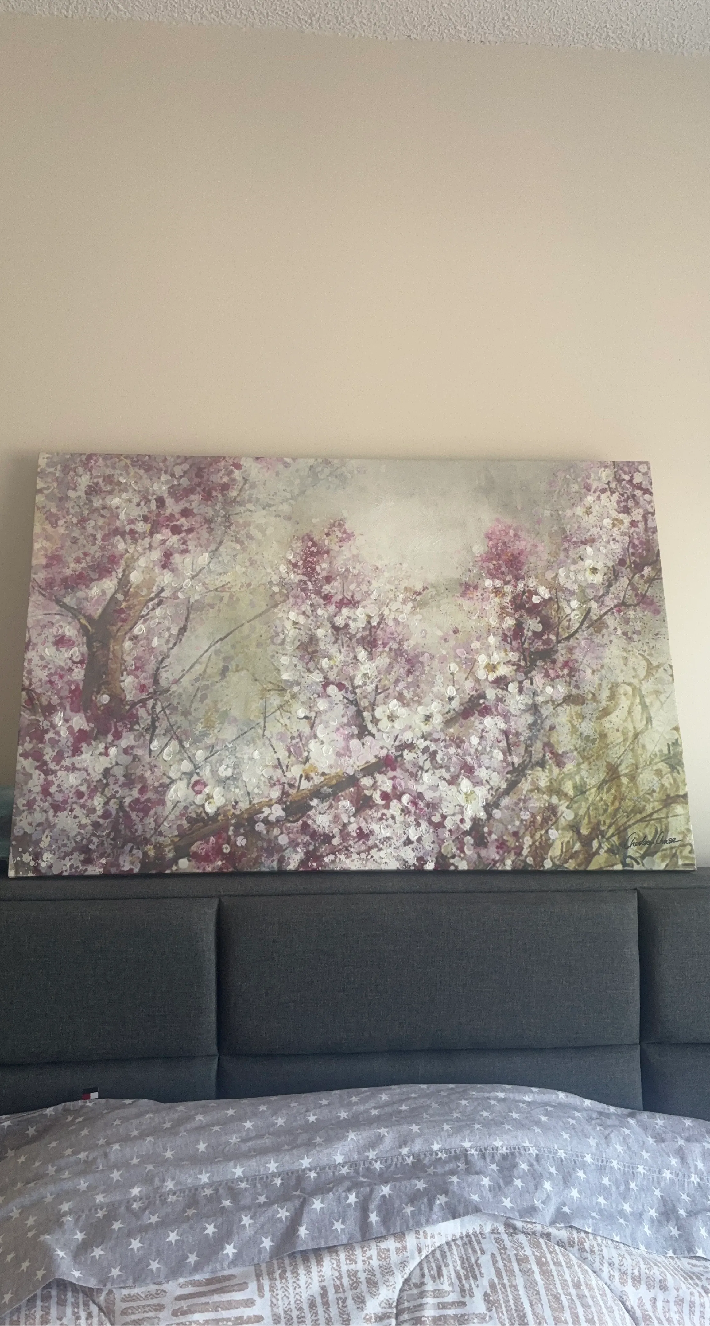 Beautiful canvas print featuring a delicate cherry blossom tree. Its vibrant colours add a touch of spring to any room. This piece is signed by the artist, Chelsea Chase.