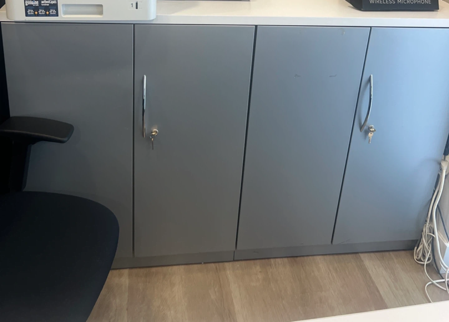 Grey metal storage cabinet. It has four lockable doors with keys included. Perfect for securing office supplies or personal items! Great for a home office or workspace.
