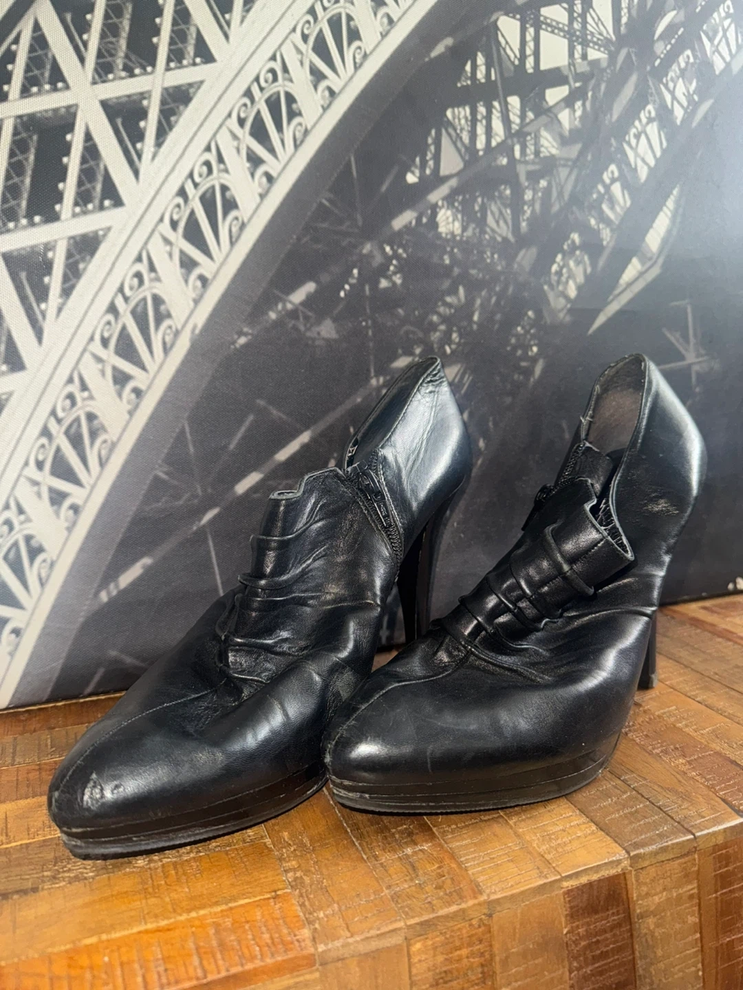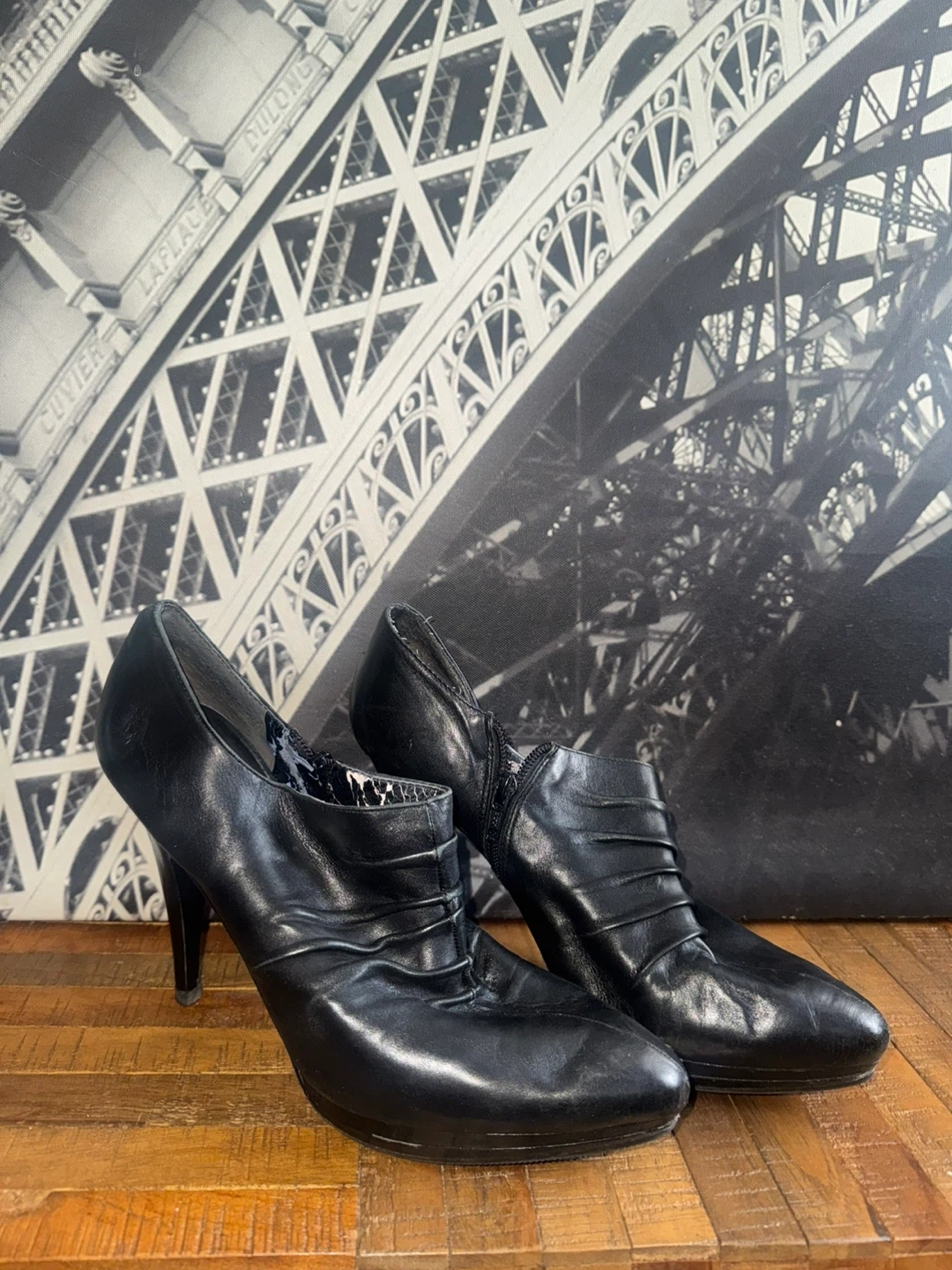 Stylish black leather ankle boots with a side zipper closure. These boots feature a ruched detail on the front and a pointed toe with a stiletto heel. Perfect for dressing up any outfit!