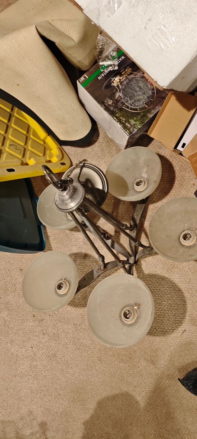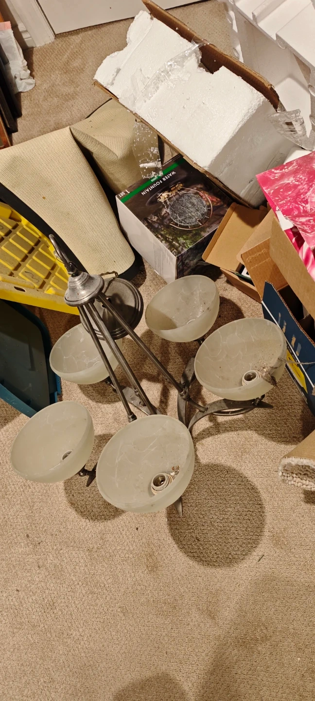 This is a 5-light chandelier with frosted glass shades. It features a brushed nickel finish and an adjustable hanging height. This fixture would add a touch of elegance to any room.