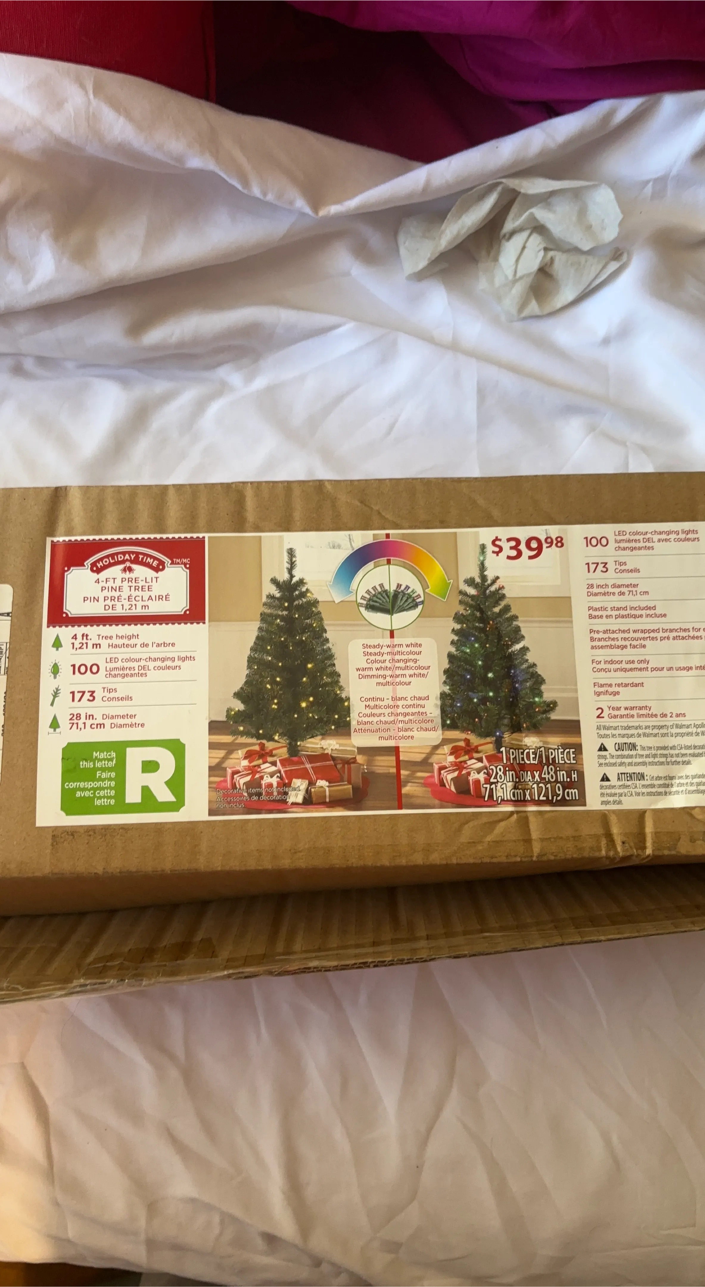 This is a 4-foot pre-lit artificial pine tree. It comes with 100 LED colour-changing lights and 173 tips. The diameter is 28 inches.