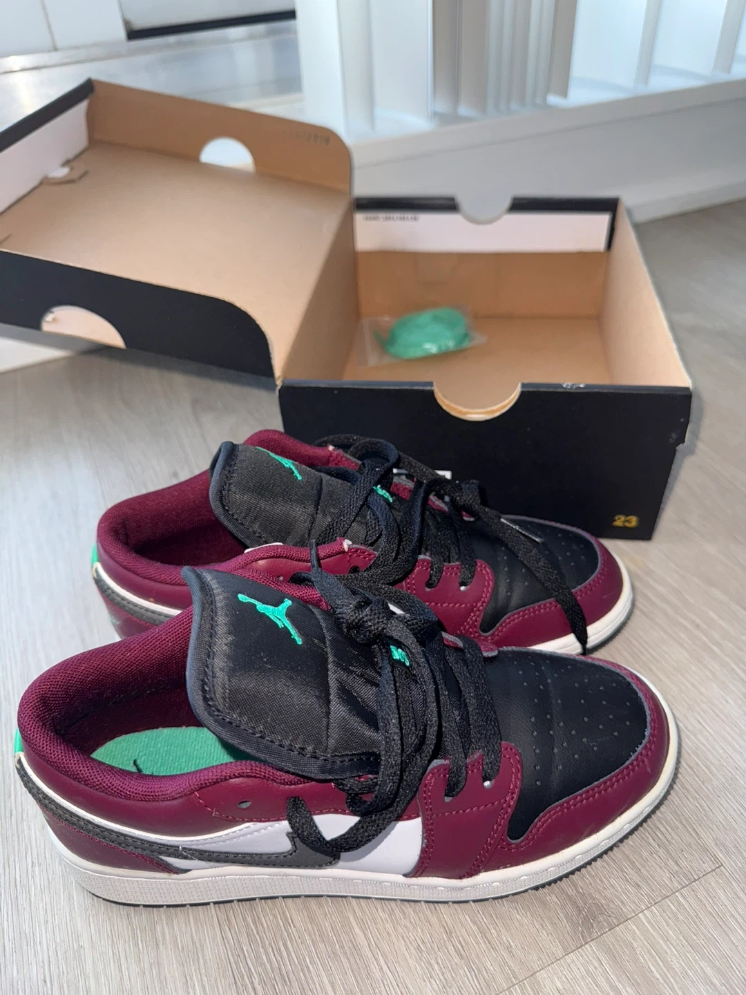 These Air Jordan 1 Lows come in a stylish burgundy, white, and black colourway. They feature a durable leather and synthetic upper. Includes extra green laces.