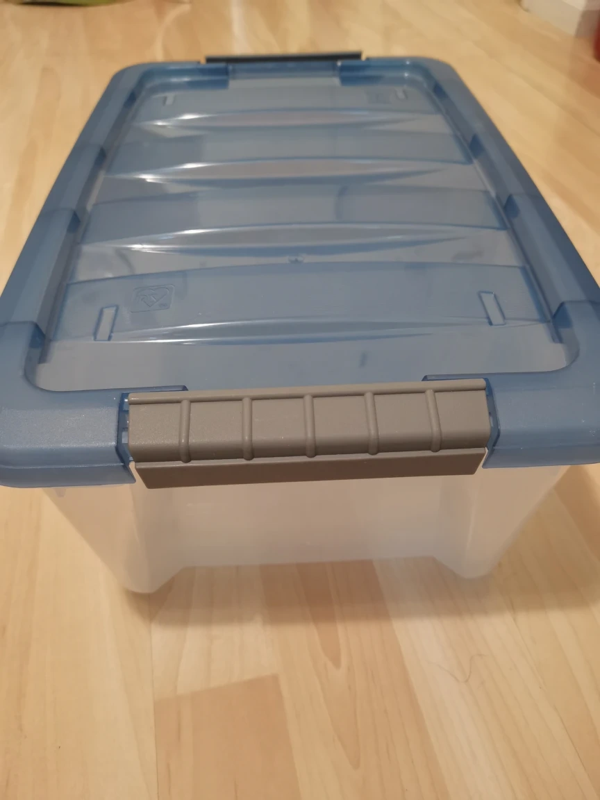 This is a storage bin with a blue lid and clear base. It has two grey latches to secure the lid. This bin is great for organizing items in your home or garage.
