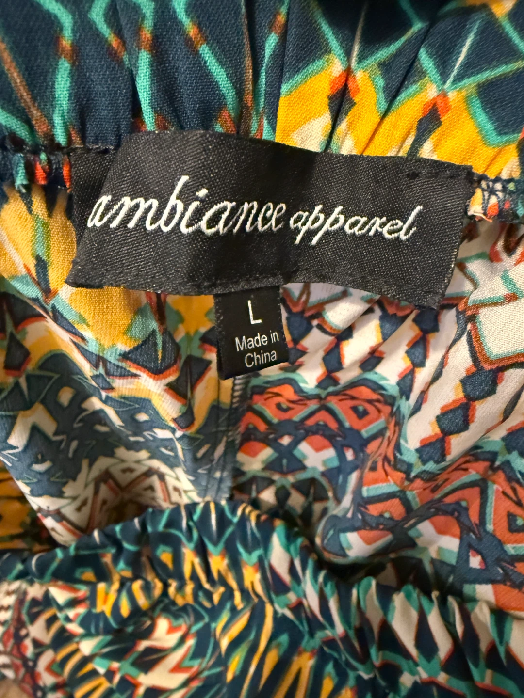 These Ambiance Apparel pants feature a vibrant and eye-catching pattern! They are a size large and would be a great addition to your wardrobe. The elastic waistband ensures a comfortable fit