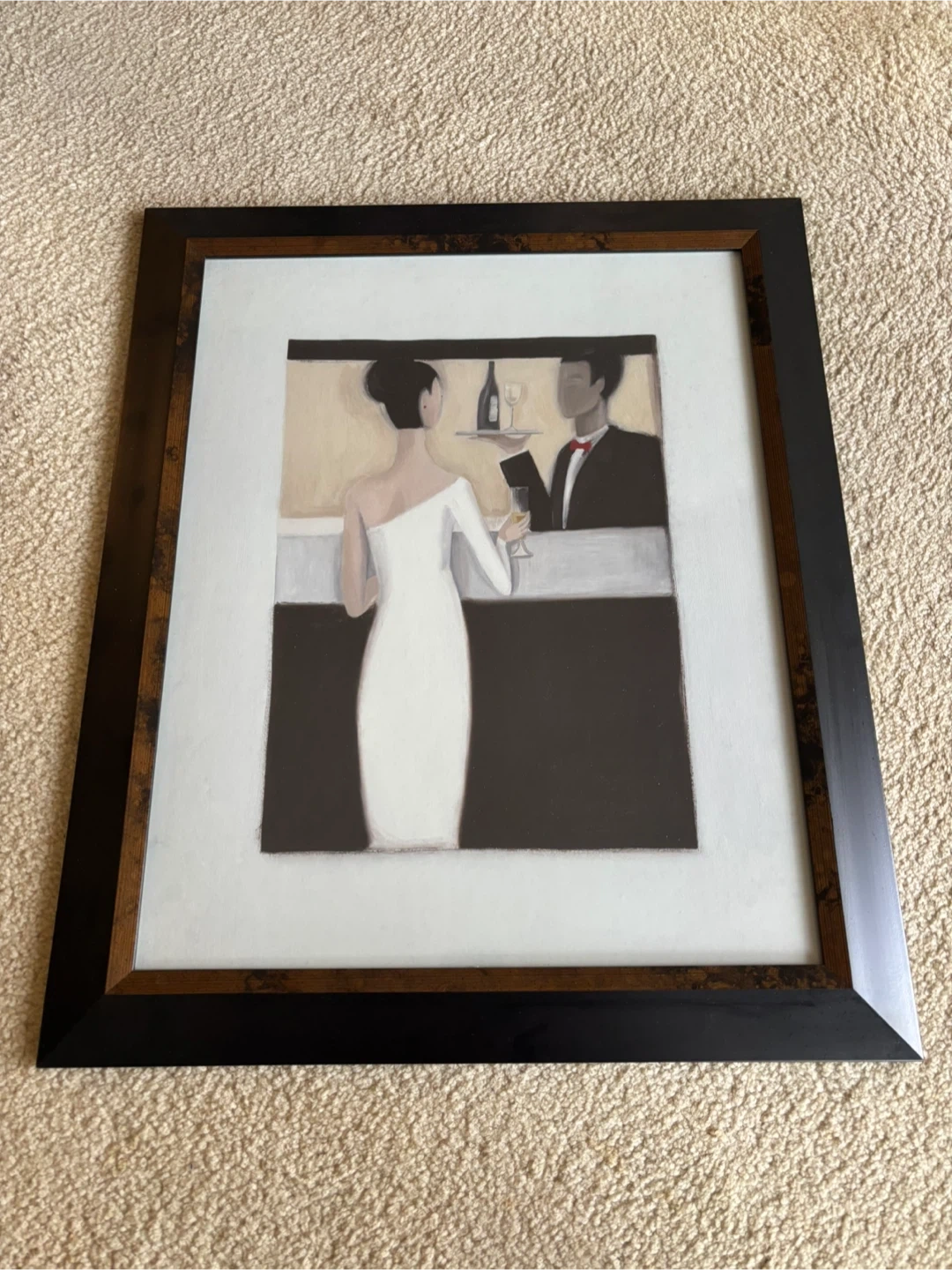 Framed art print featuring a couple at a bar. The artwork depicts a woman in a white dress and a man in a tuxedo. It's ready to hang with a sawtooth hanger on the back. Dimensions: 18x24 inches.