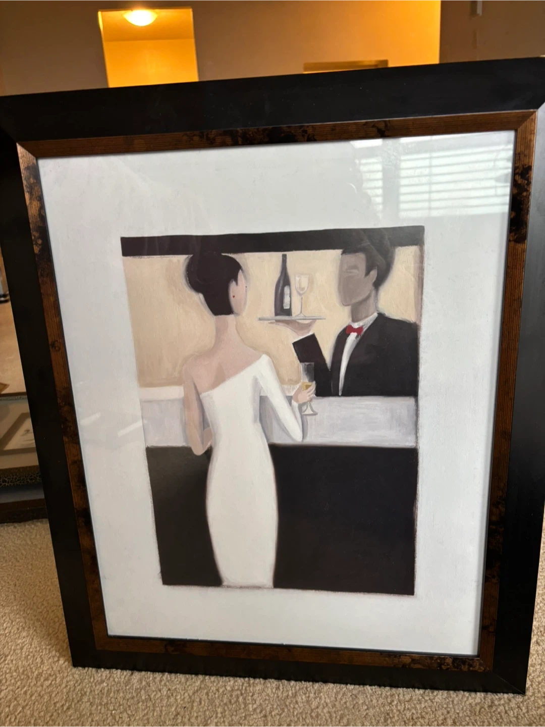Framed art print featuring a couple at a bar. The artwork depicts a woman in a white dress and a man in a tuxedo. It's ready to hang with a sawtooth hanger on the back. Dimensions: 18x24 inches.