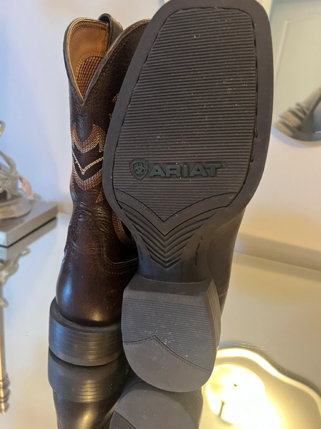 Selling a pair of Ariat men's cowboy boots in US size 9.5EE. These stylish boots feature a classic design with intricate stitching. They're in great condition and ready for a new adventure!