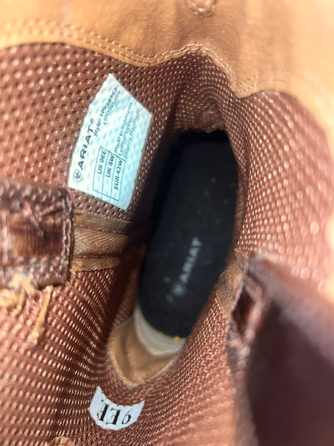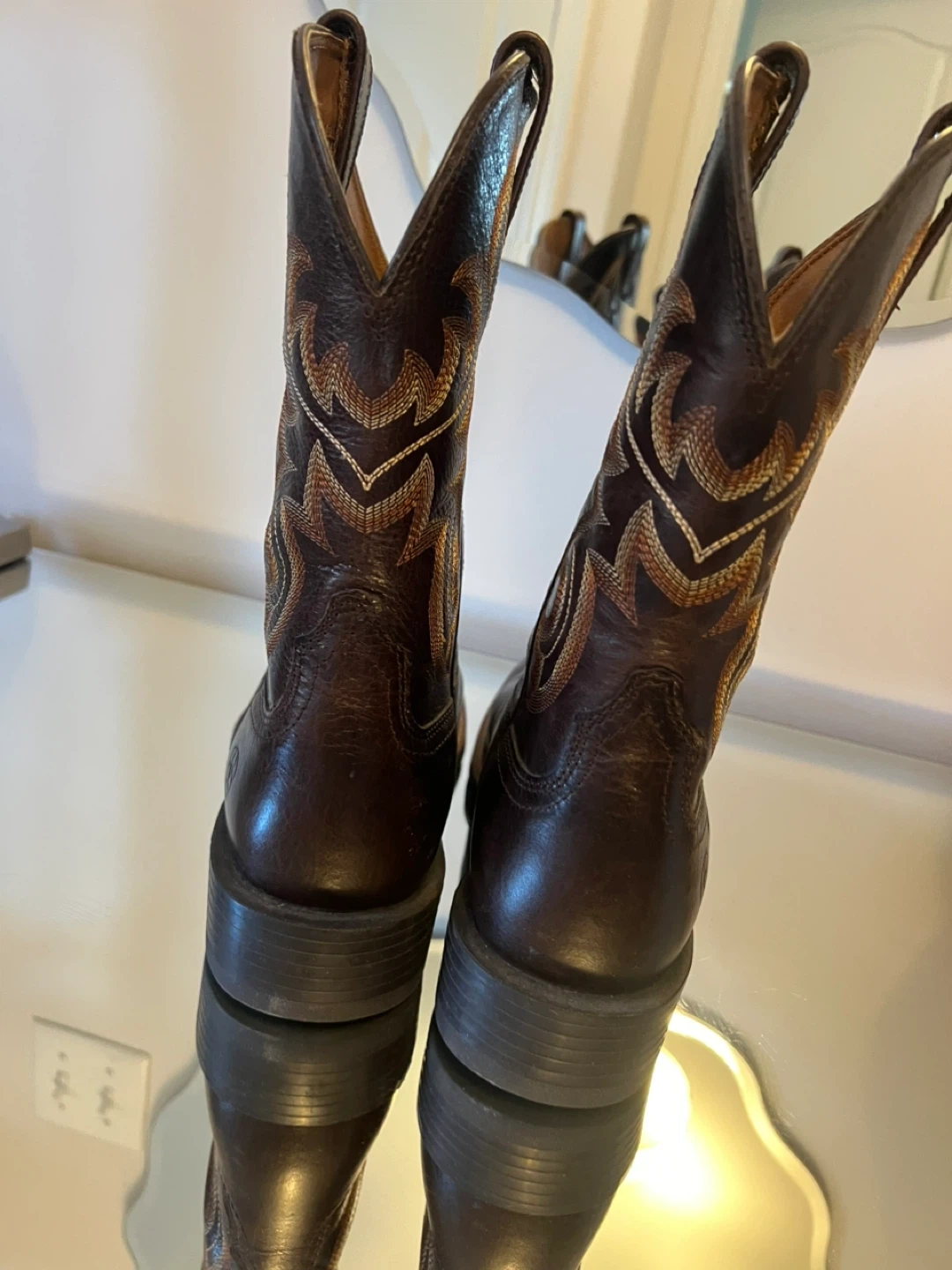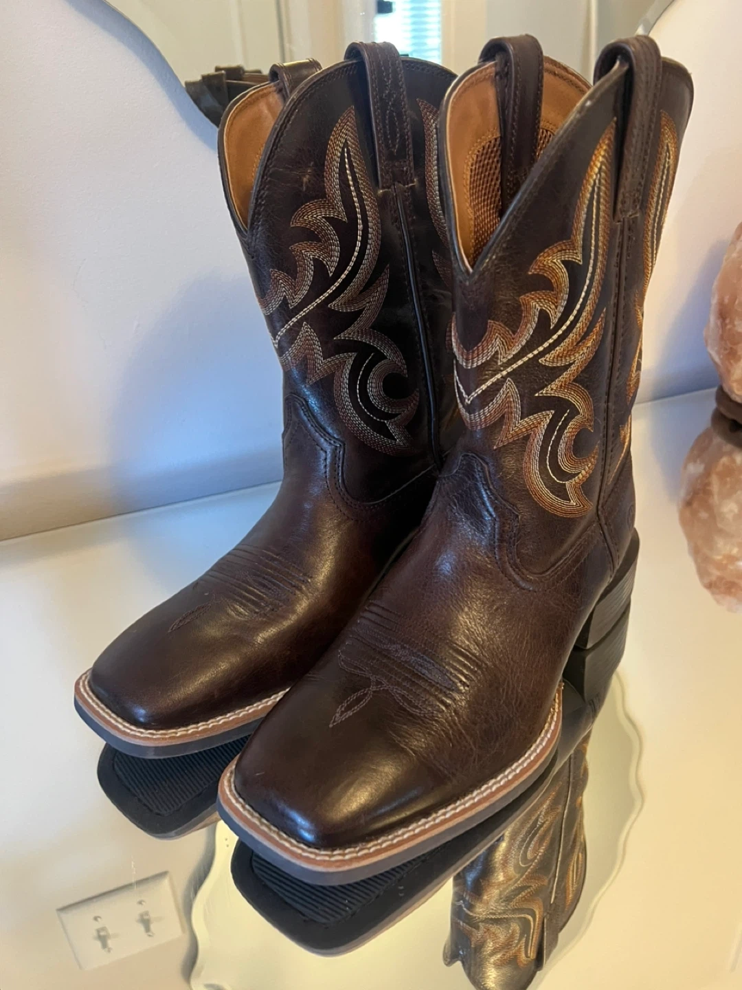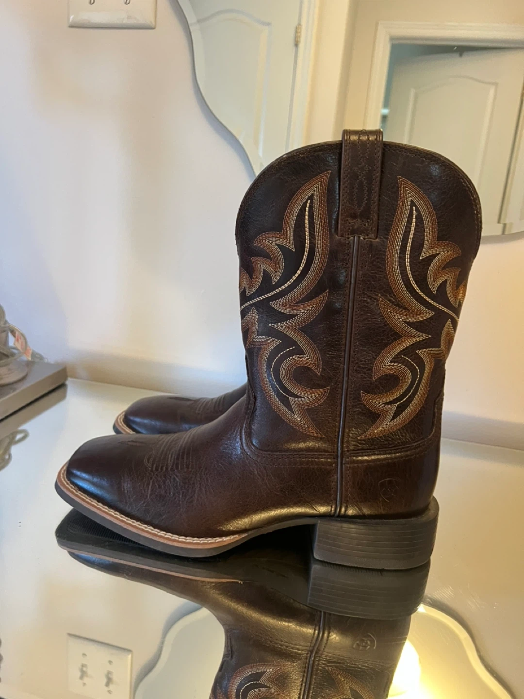 Selling a pair of Ariat men's cowboy boots in US size 9.5EE. These stylish boots feature a classic design with intricate stitching. They're in great condition and ready for a new adventure!