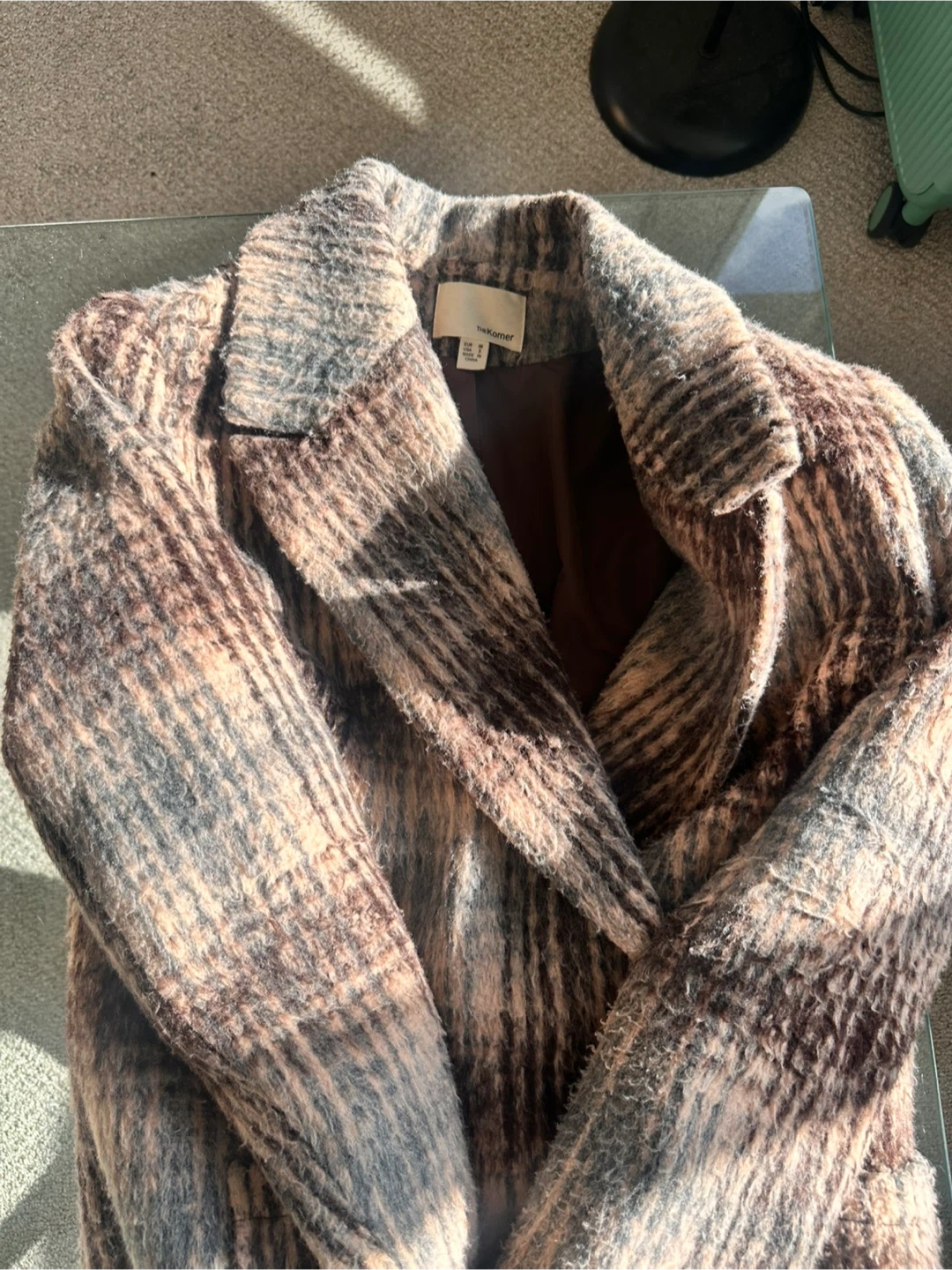 Cozy and stylish plaid wool blend coat. It's a double-breasted design with two front pockets. Perfect for keeping warm on chilly days!