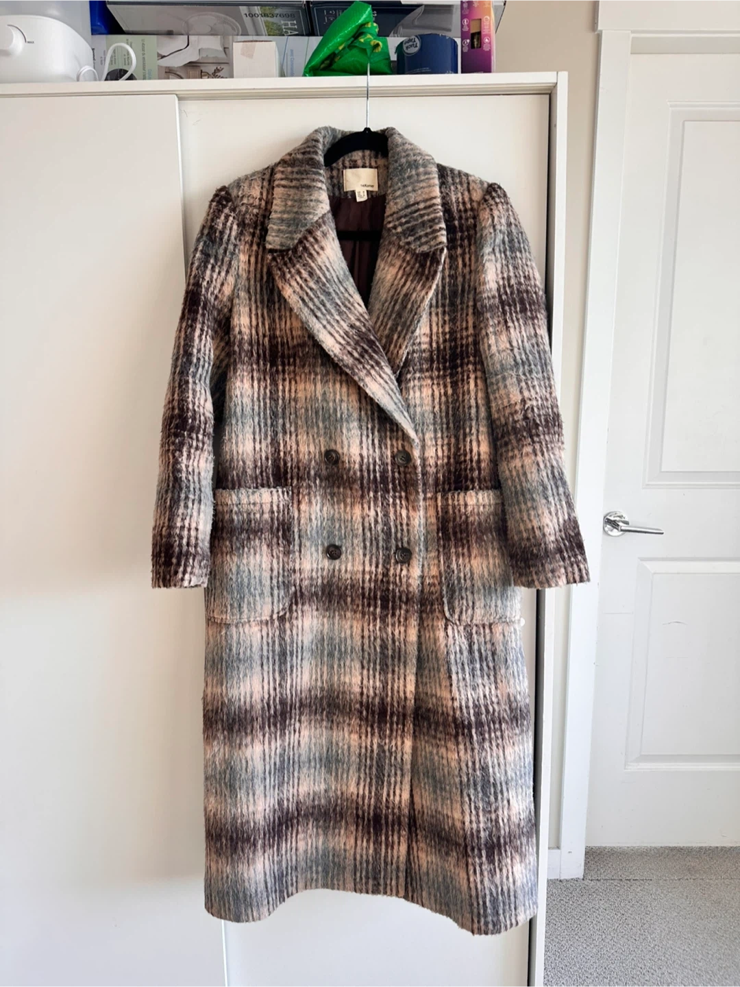 Cozy and stylish plaid wool blend coat. It's a double-breasted design with two front pockets. Perfect for keeping warm on chilly days!