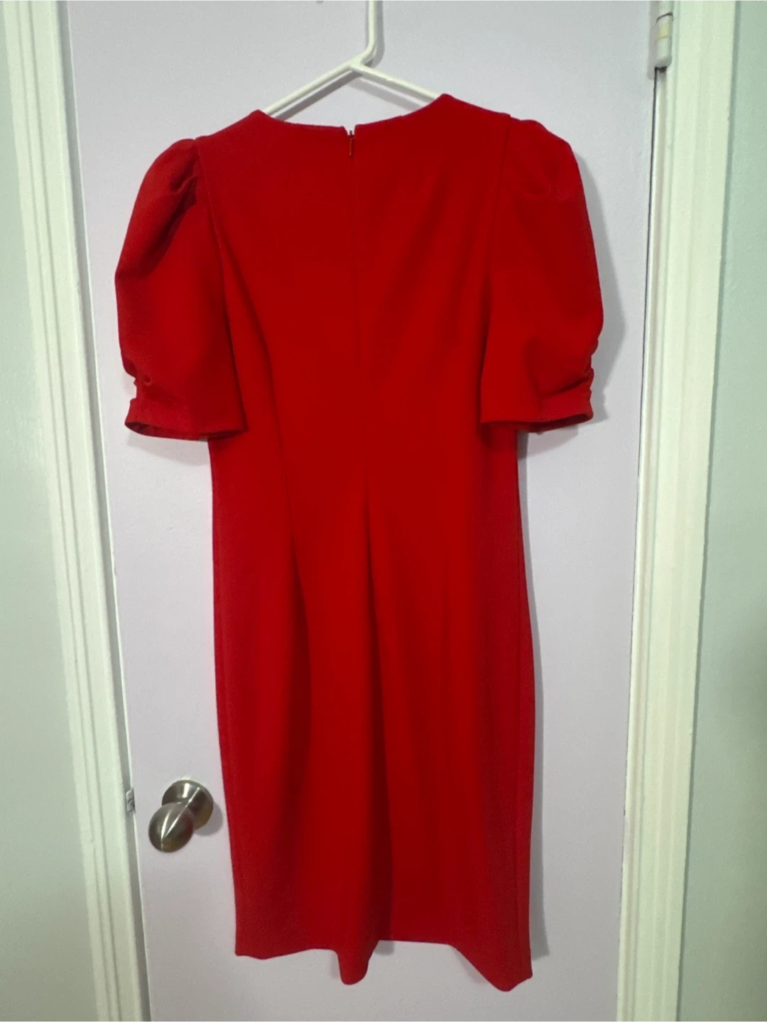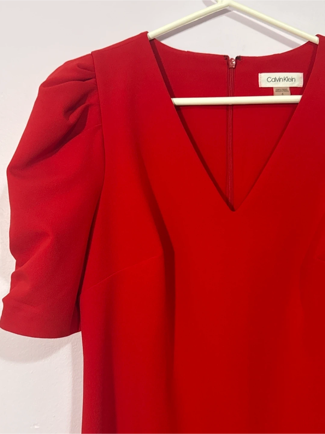 Calvin Klein sheath dress in a bold red colour. It features stylish puff sleeves and a flattering v-neckline. Back zipper closure. Size 6.