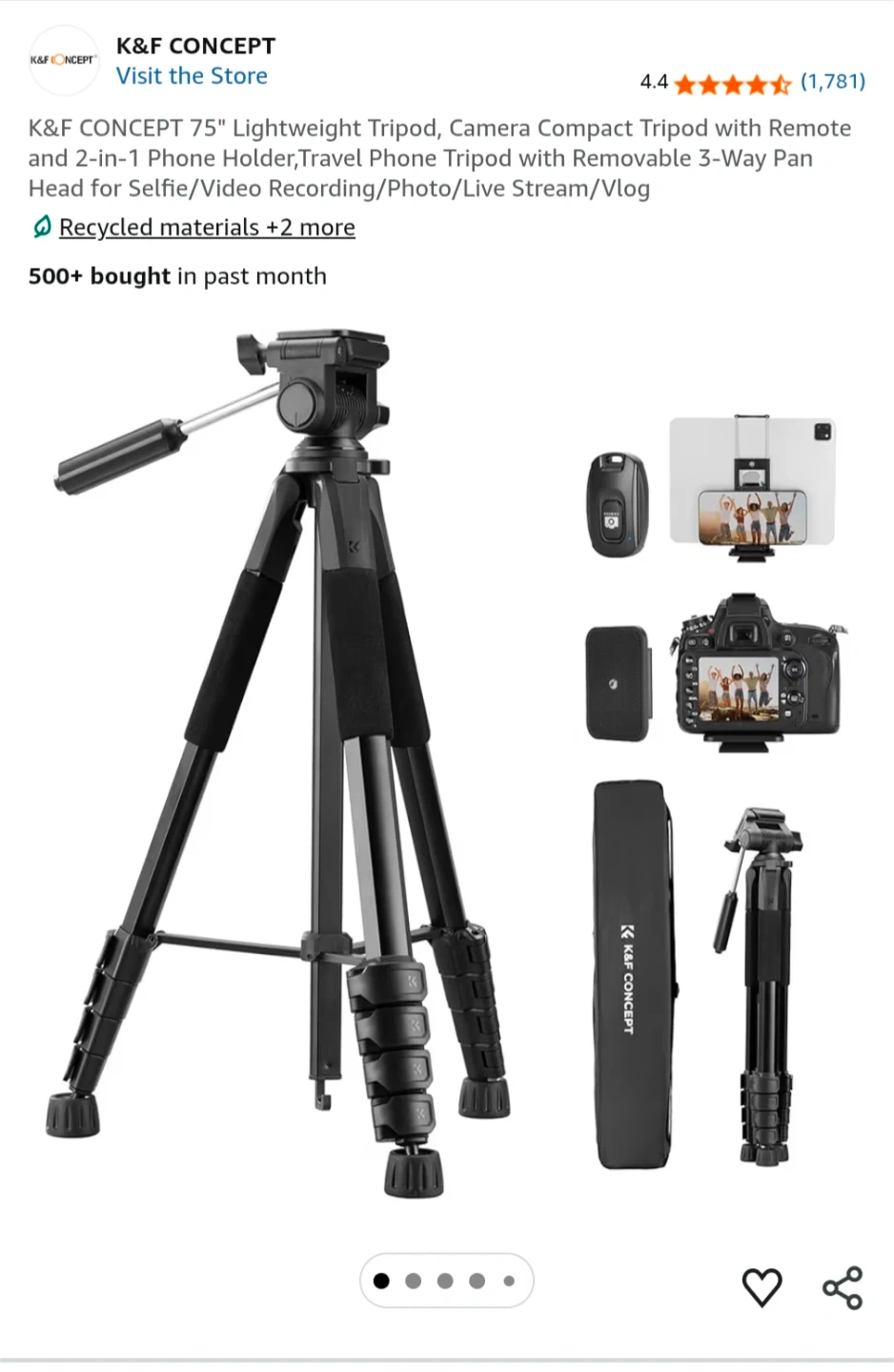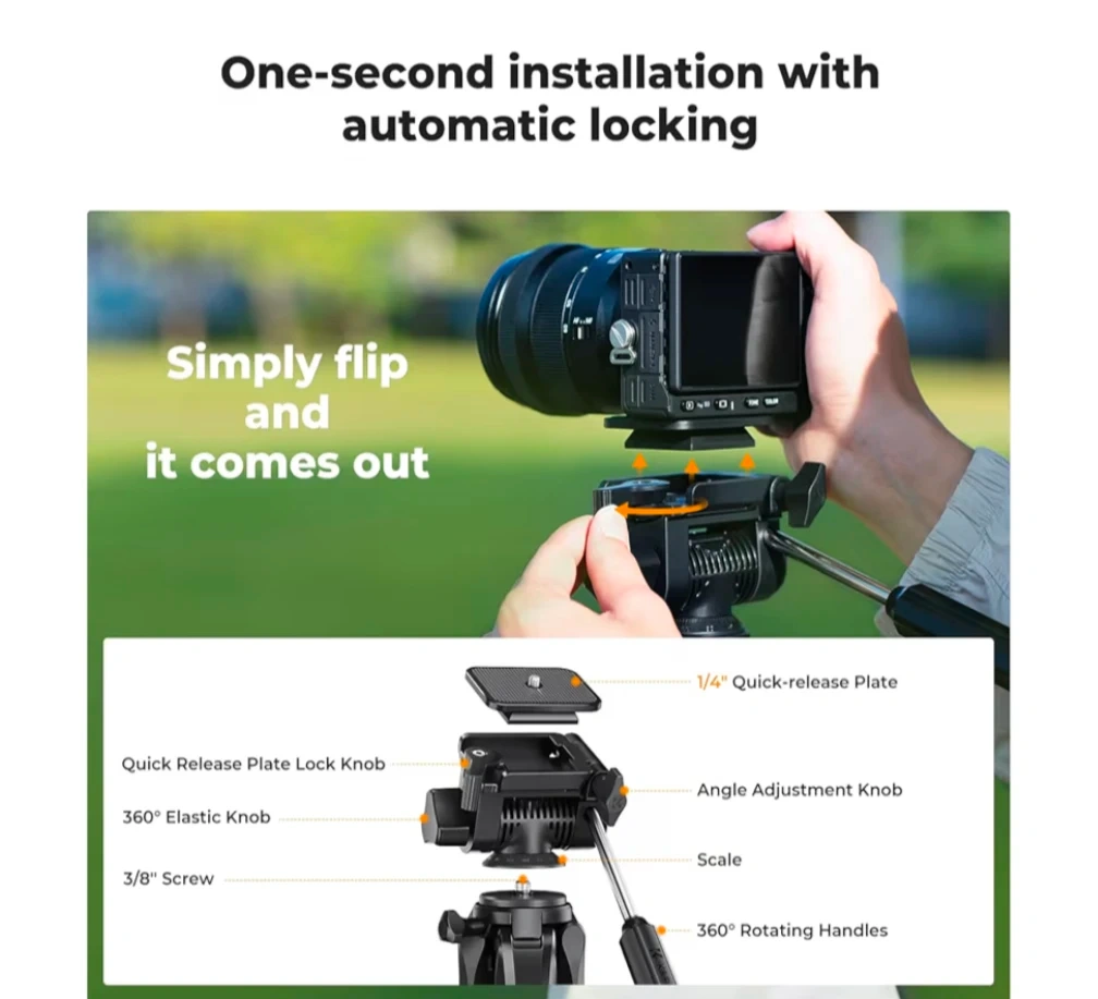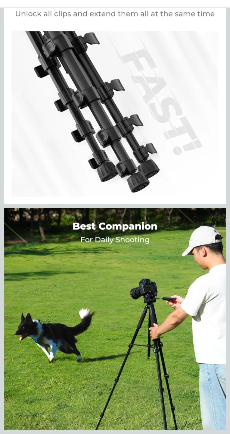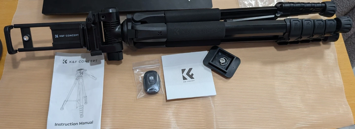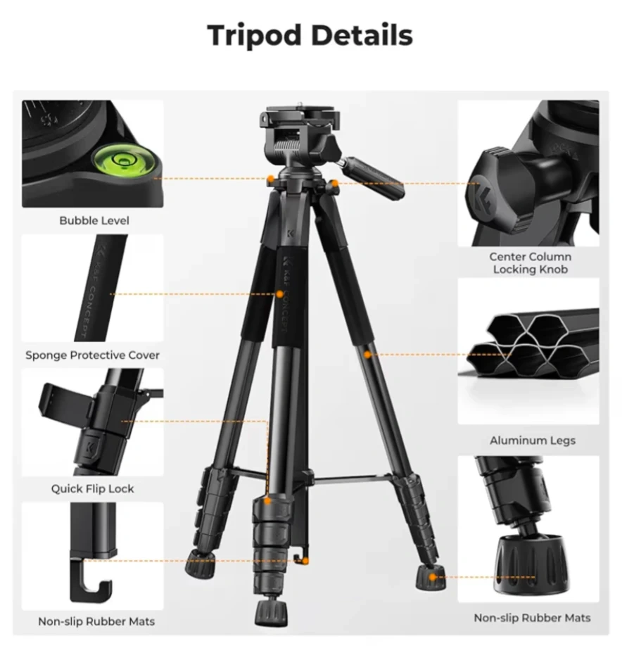 This is a K&F CONCEPT lightweight tripod, extending up to 75 inches. It includes a 2-in-1 phone holder, a removable 3-way pan head, and a remote for convenient use. Its aluminum legs feature quick flip locks for fast adjustments. This tripod is useful for daily shooting, videography, and live streaming.