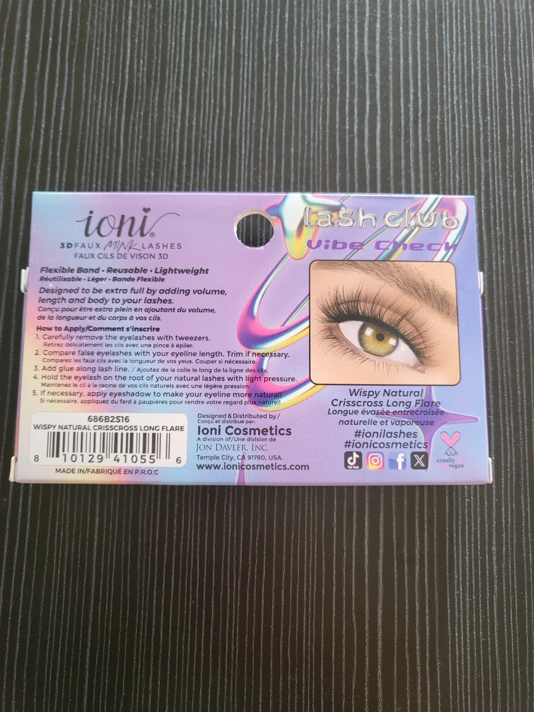 Selling a brand new pair of ioni Vibe Check lashes! These are the Wispy Natural Crisscross Long Flare style, and they're 3D faux mink lashes. They're 100% handmade and cruelty-free. The packaging describes them as flexible, bendable, reusable, and lightweight!