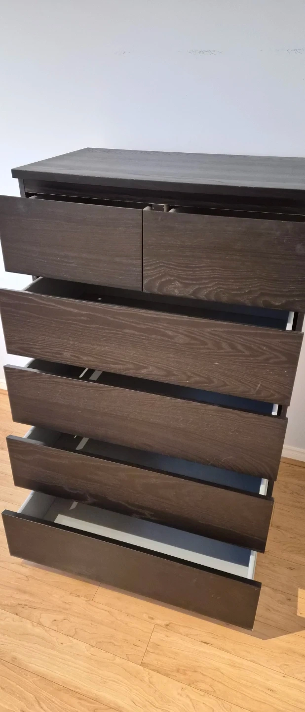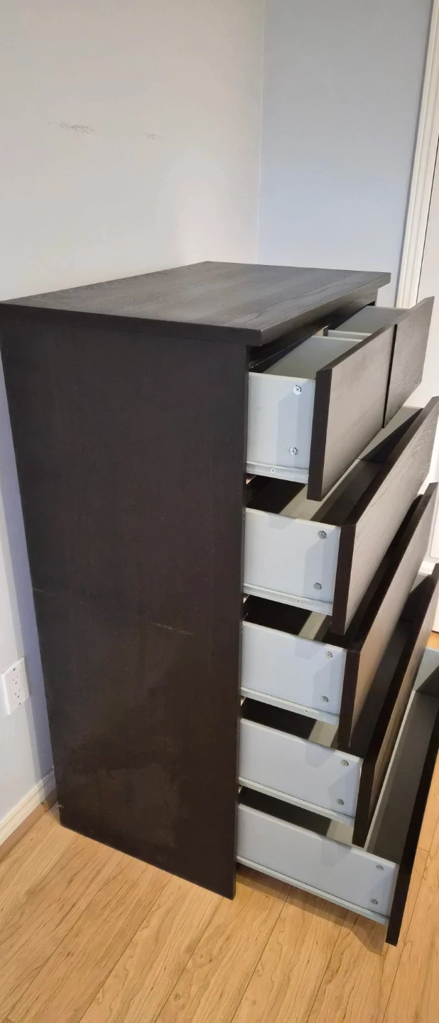 Dark brown dresser with six drawers. It's made of particleboard with a laminate finish. This dresser is perfect for storing clothes and other items.