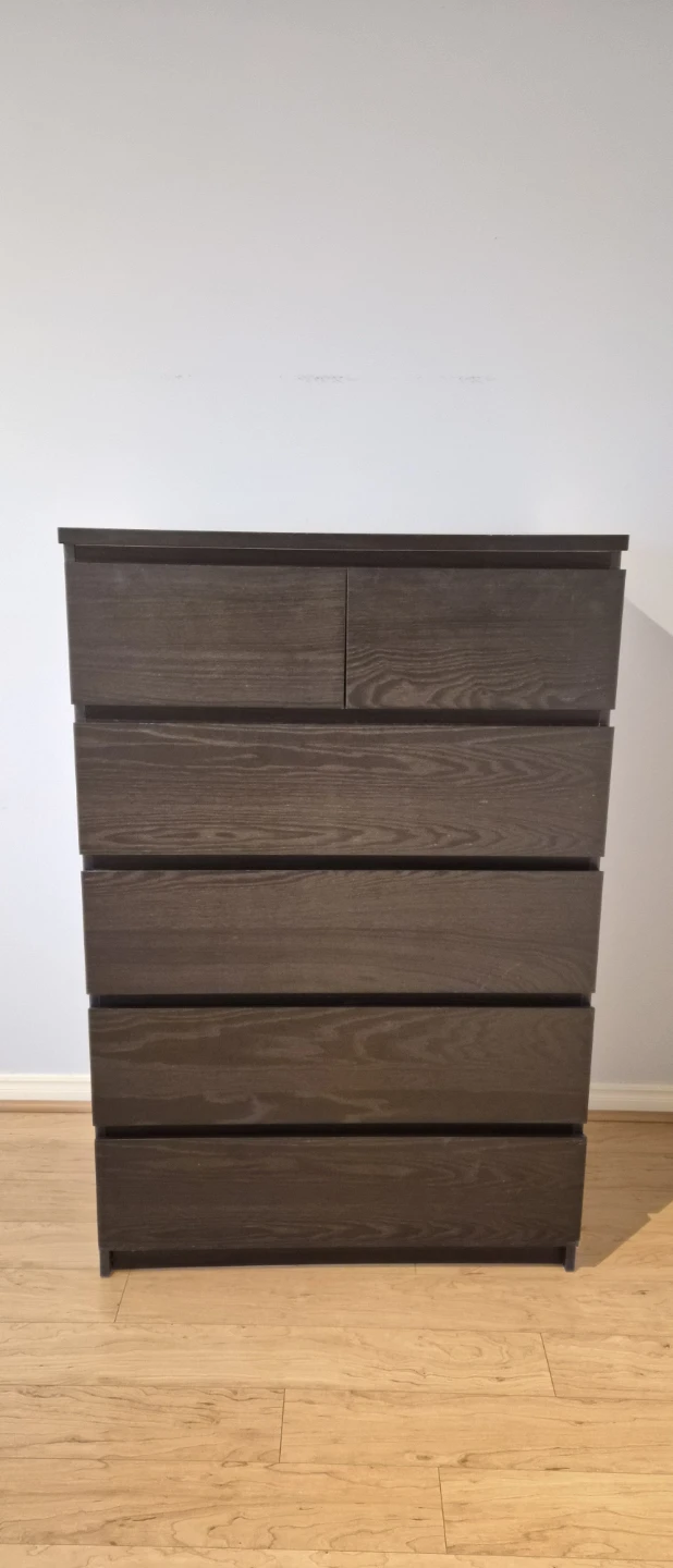 Dark brown dresser with six drawers. It's made of particleboard with a laminate finish. This dresser is perfect for storing clothes and other items.