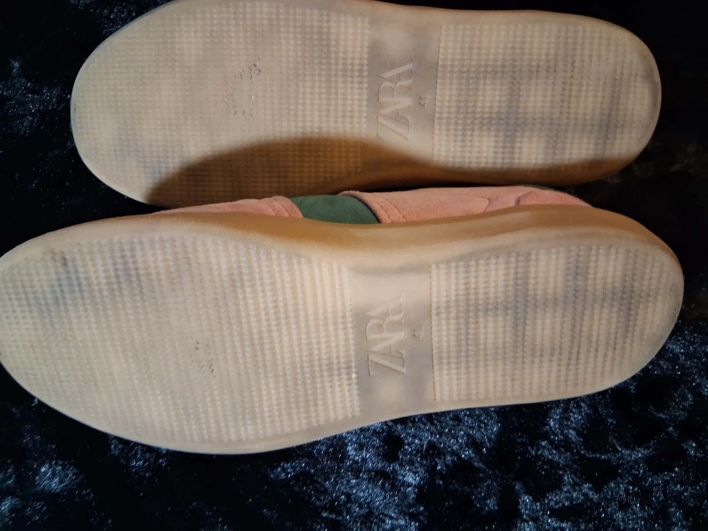 These are Zara sneakers in a pink suede with green accents. They're a size 41. The shoes have a lace-up closure and a rubber sole.