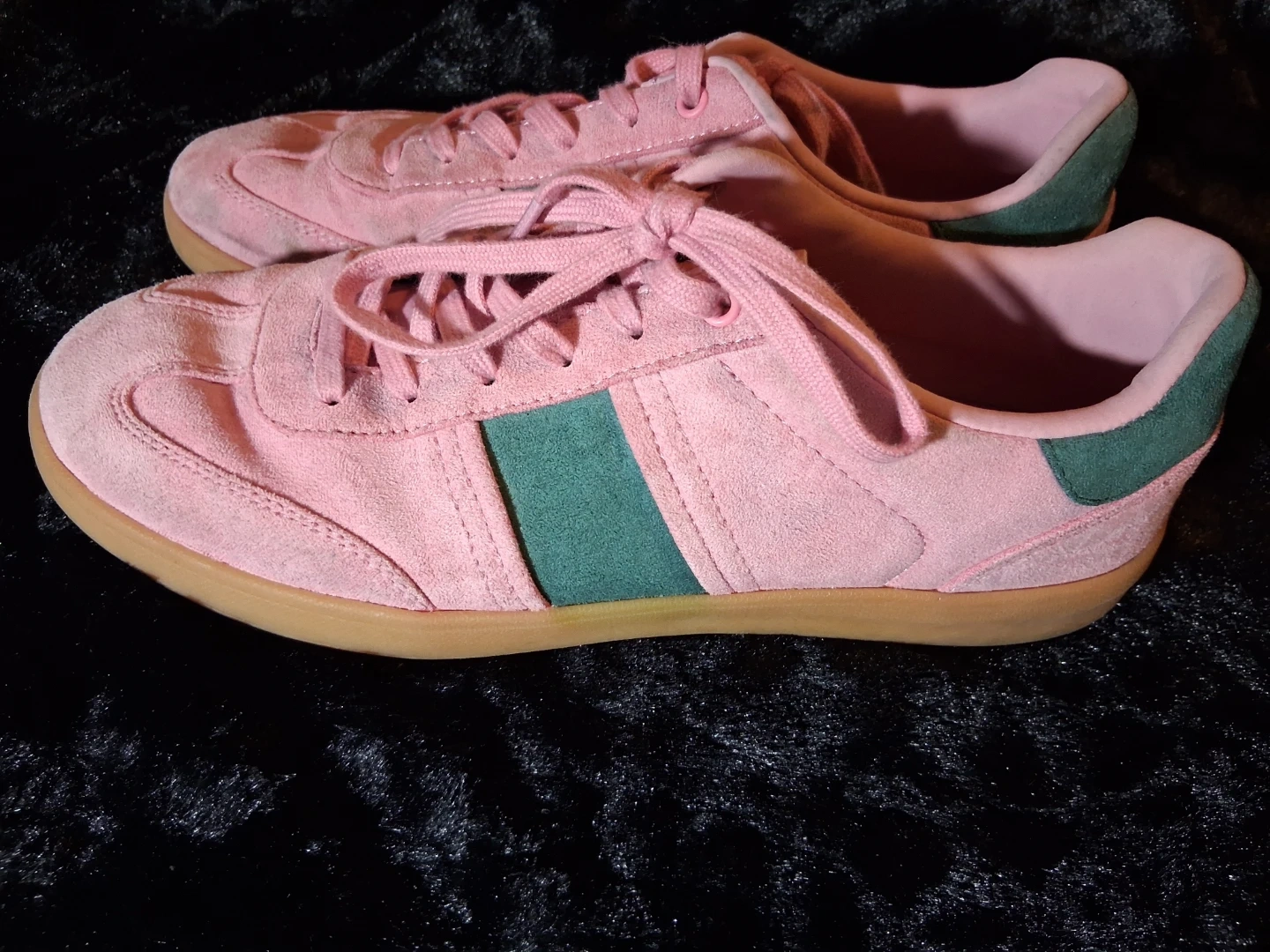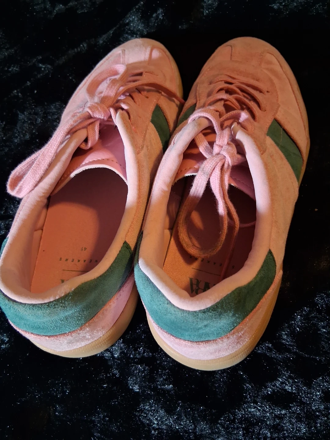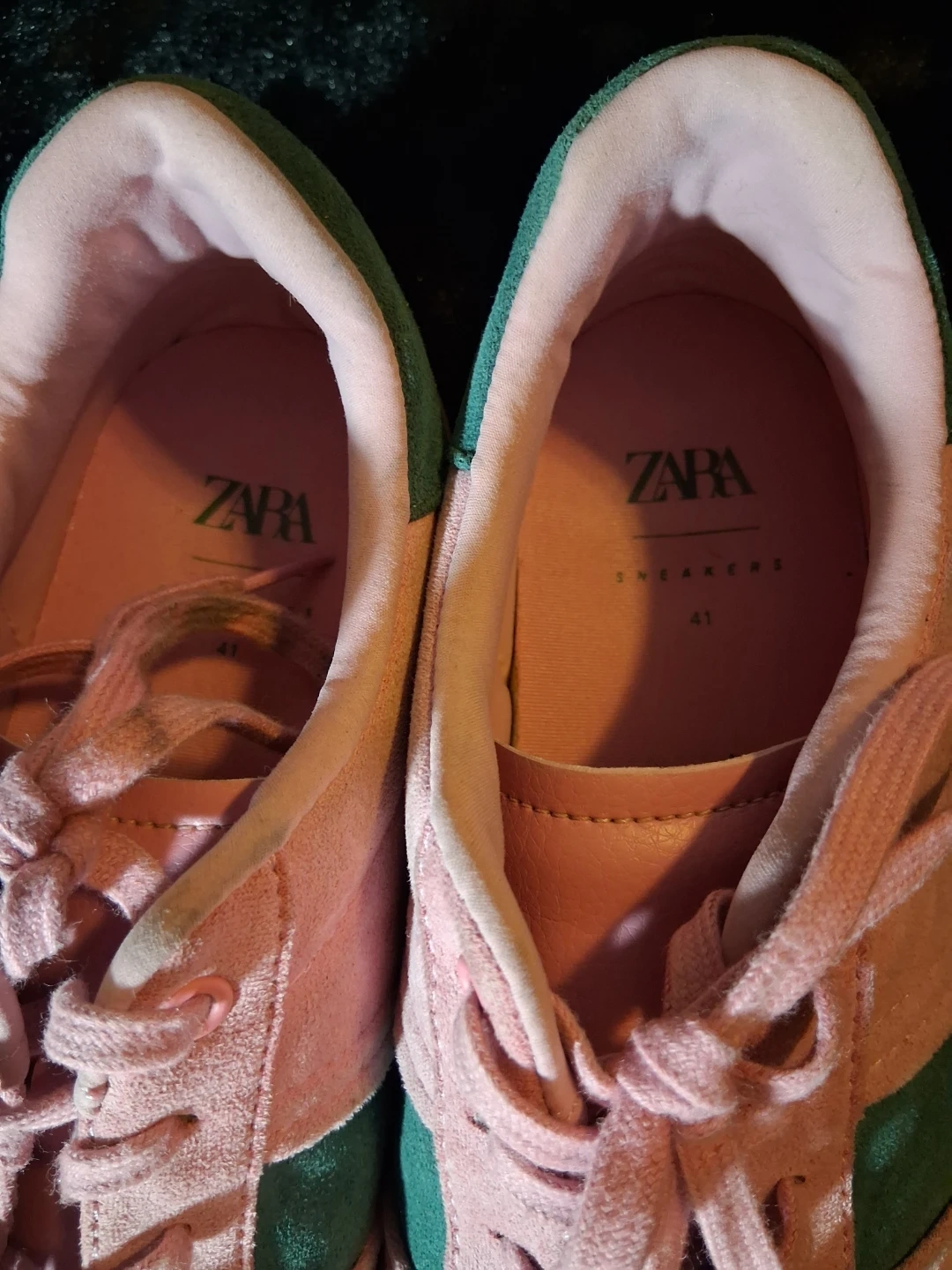 These are Zara sneakers in a pink suede with green accents. They're a size 41. The shoes have a lace-up closure and a rubber sole.