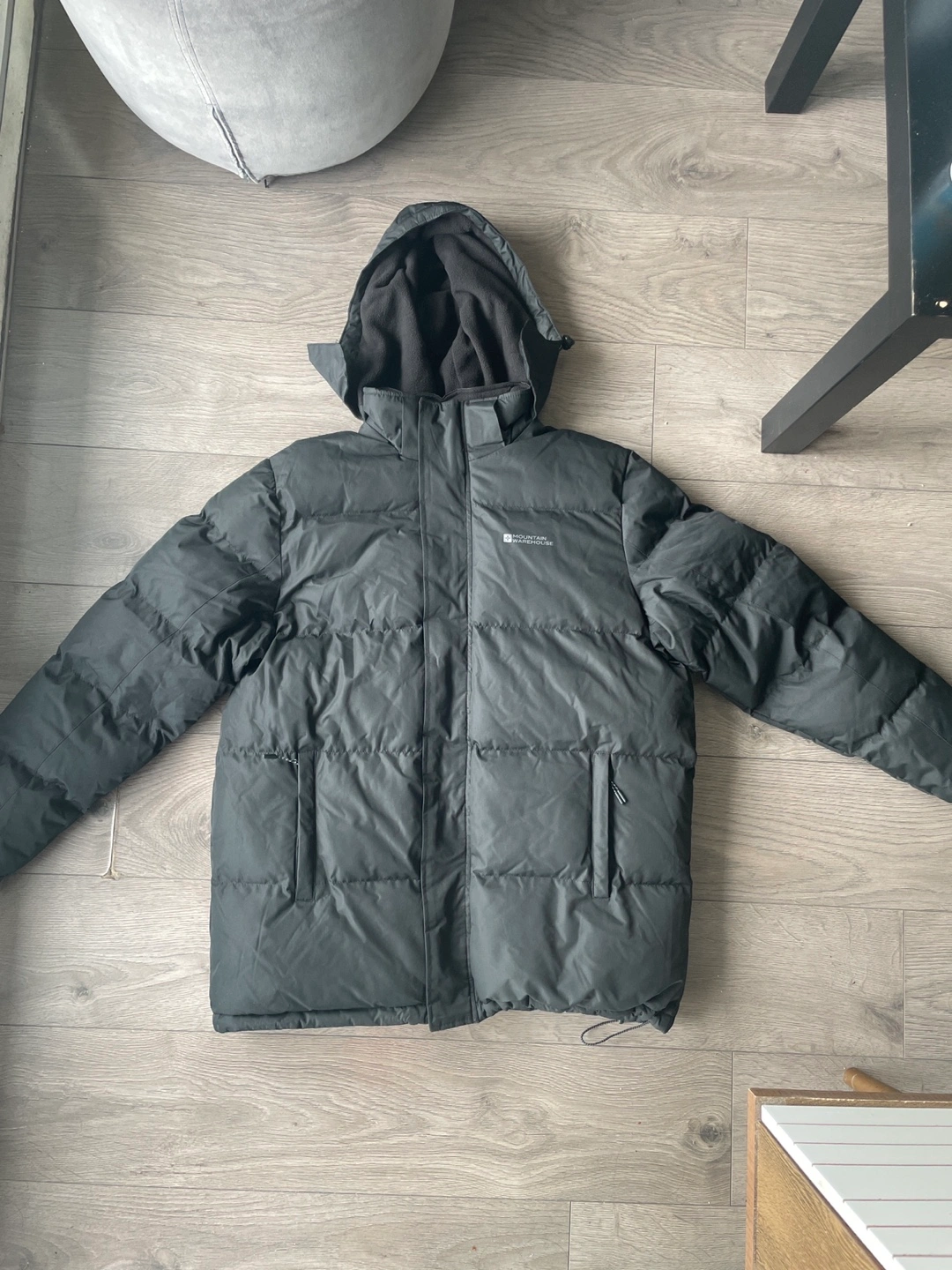 Men's black puffer jacket. Features a hood with fleece lining. Zipper closure. Excellent for cold weather.