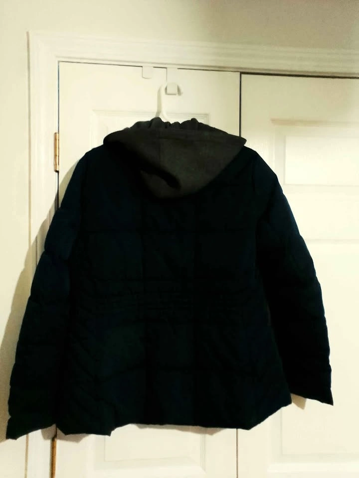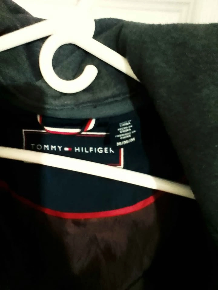 Stylish Tommy Hilfiger puffer jacket. Navy blue with a grey inner hood. Size Medium. Has snap buttons and zipper closure. Inside lining is a nice reddish-brown color. Super warm for winter.