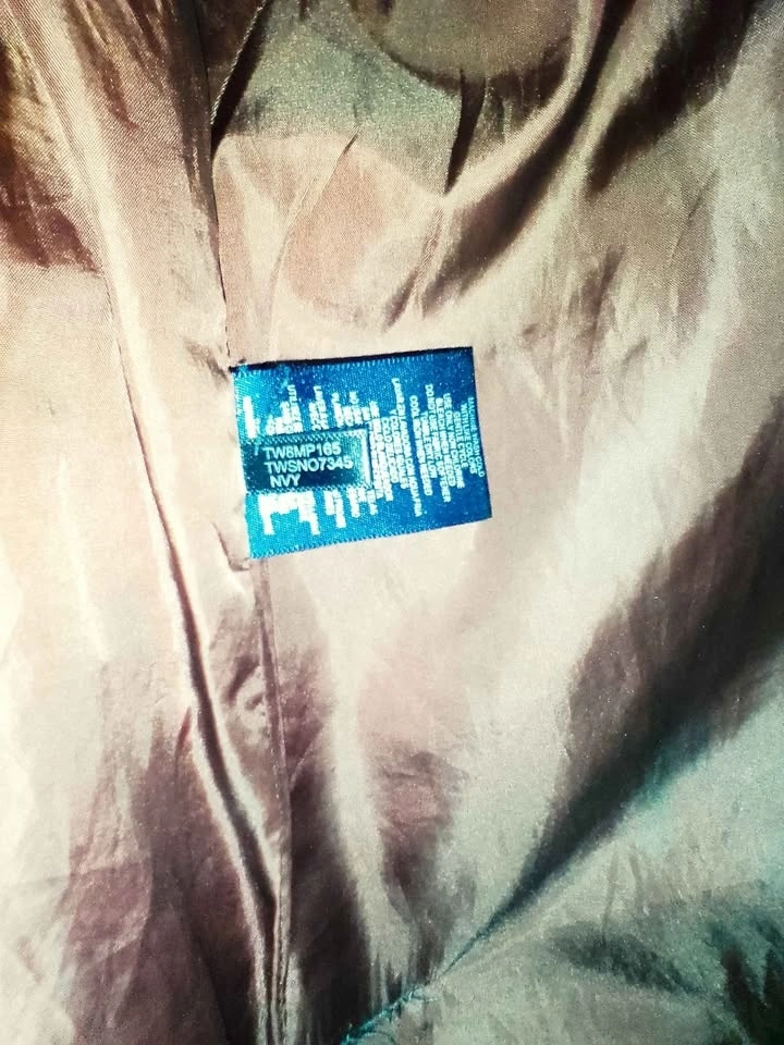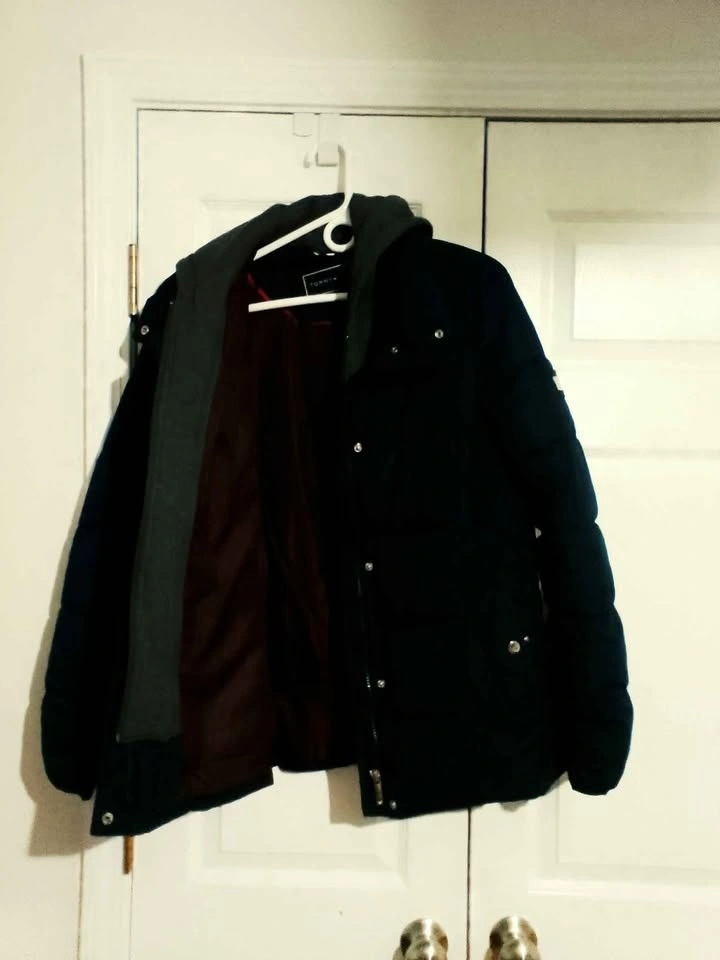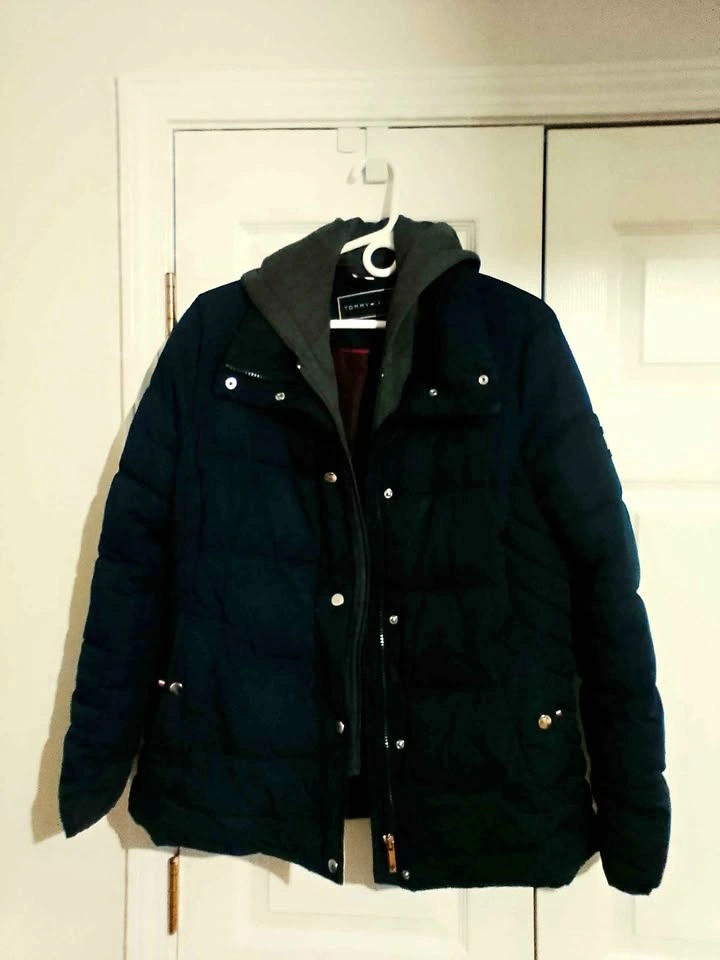 Stylish Tommy Hilfiger puffer jacket. Navy blue with a grey inner hood. Size Medium. Has snap buttons and zipper closure. Inside lining is a nice reddish-brown color. Super warm for winter.