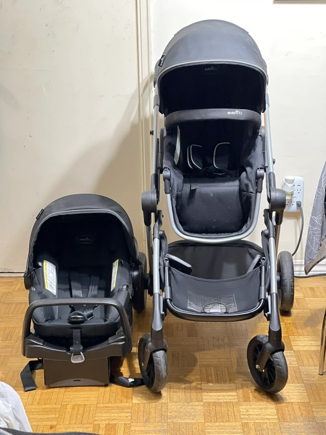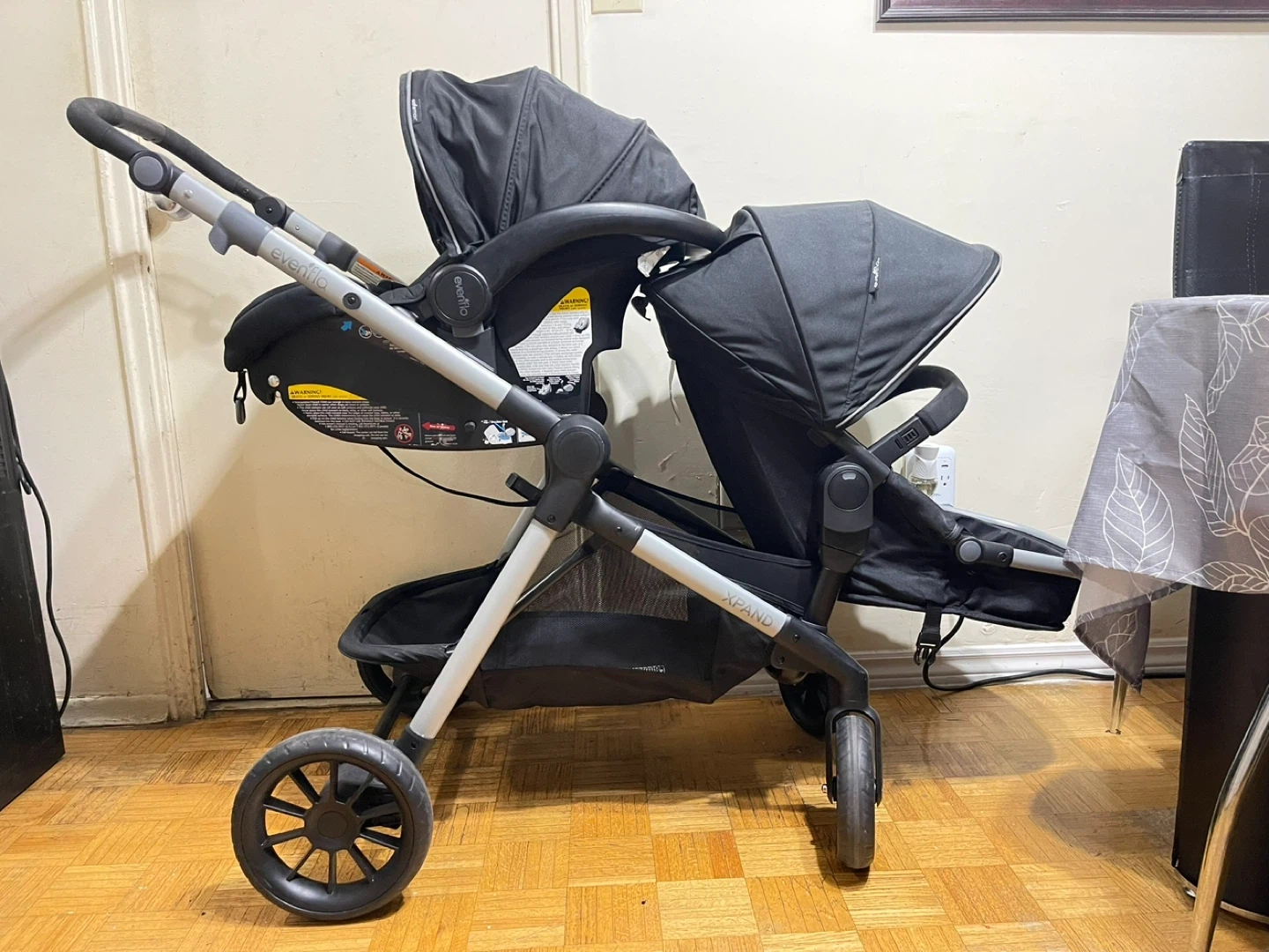 This is a black Evenflo Expand double stroller that comes with a car seat. It's great for families with two young children. The stroller offers a flexible ride for two.